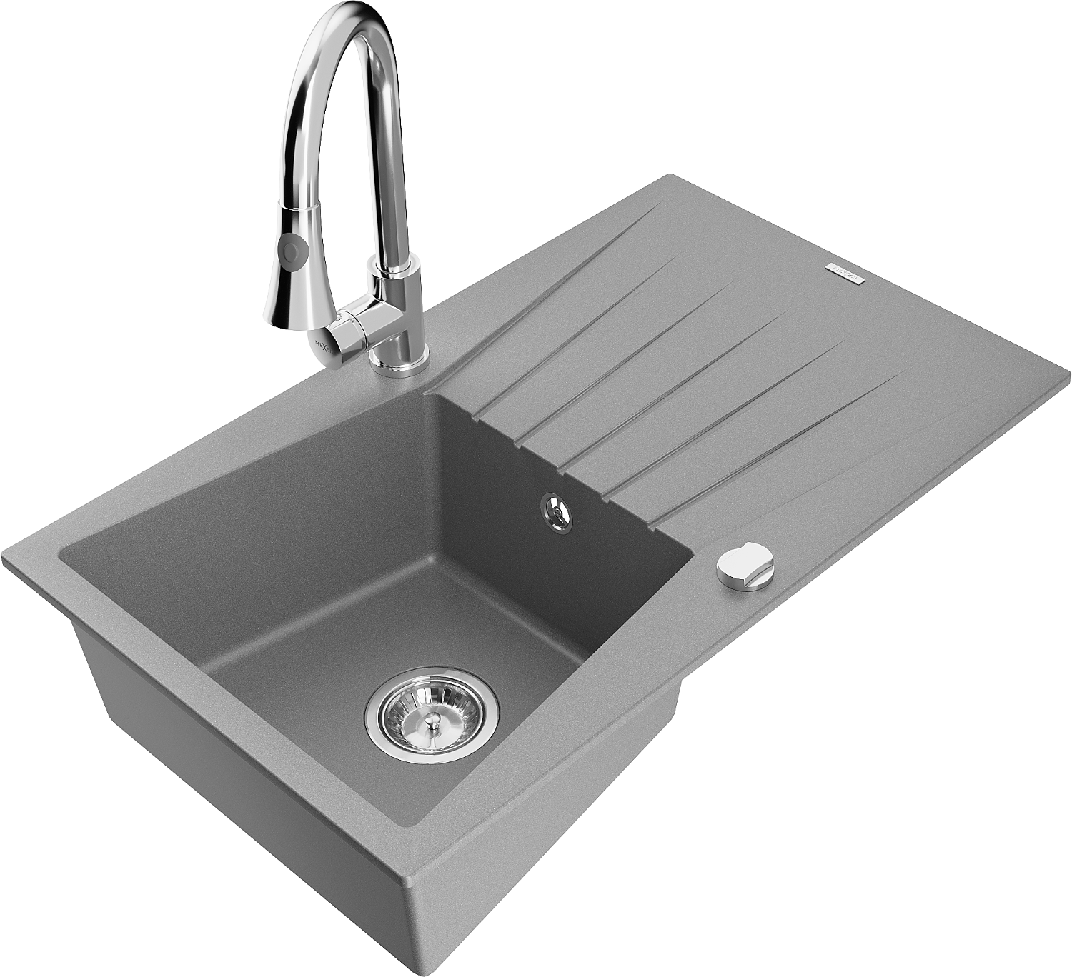 Mexen Cesar zlewozmywak granitowy 1-komorowy z ociekaczem i baterią kuchenną Elia, szary - 6514-71-670101-00