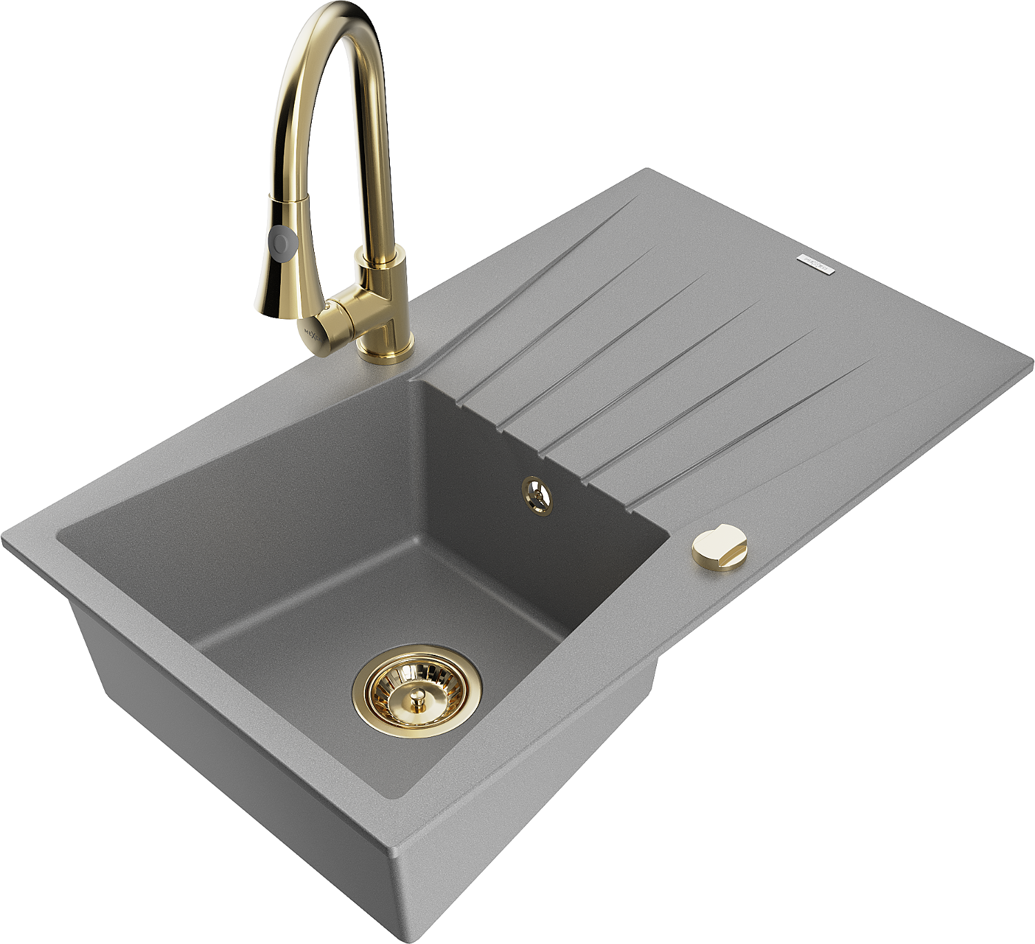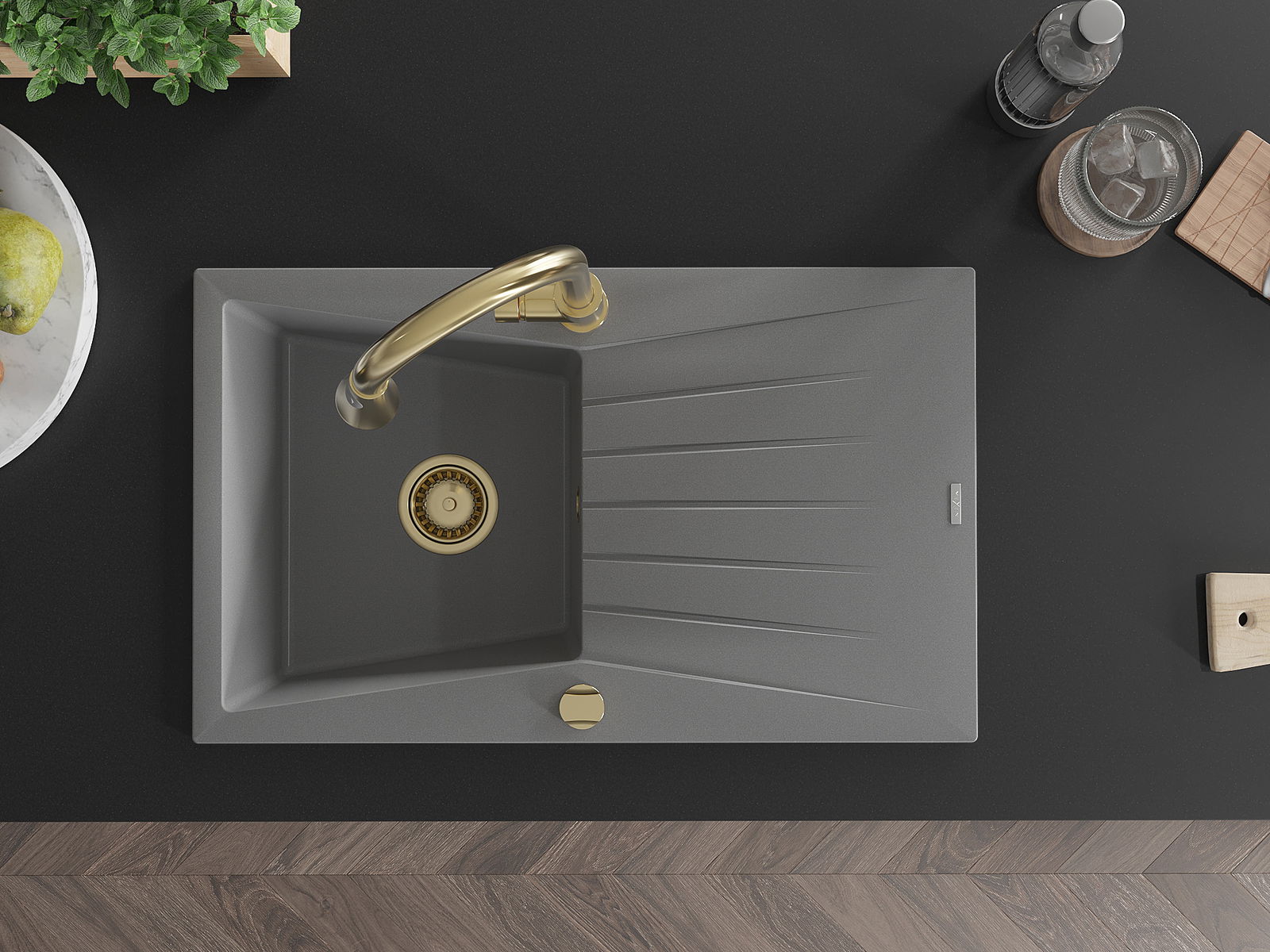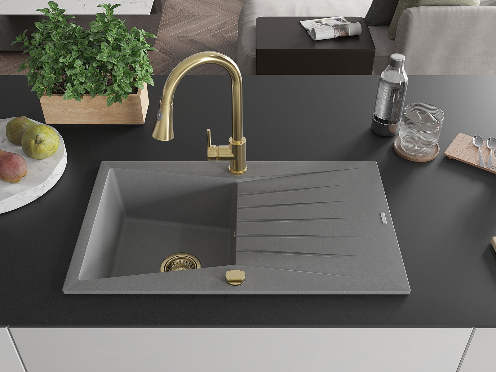 Mexen Cesar zlewozmywak granitowy 1-komorowy z ociekaczem i baterią kuchenną Elia, szary - 6514-71-670101-50