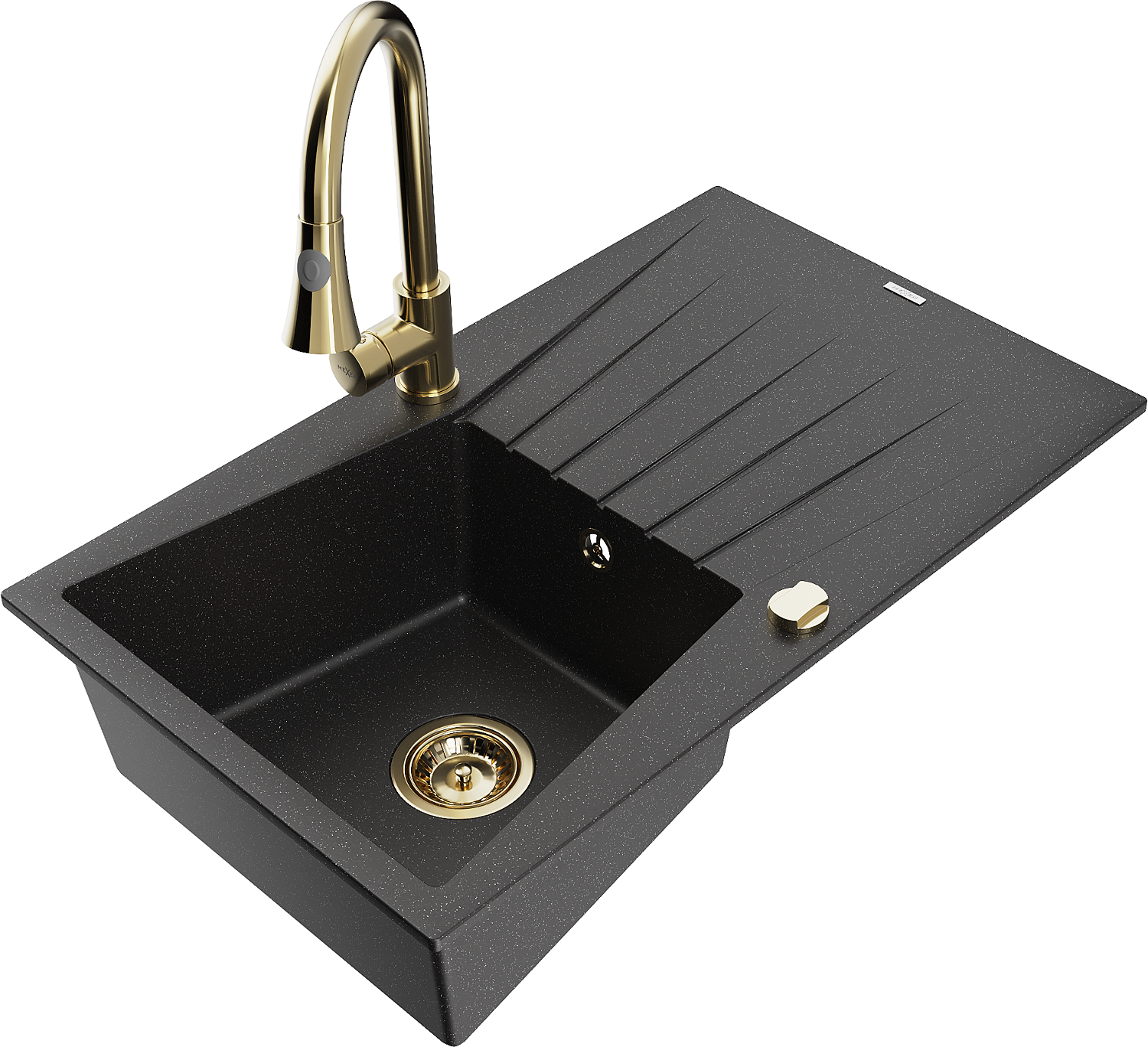 Mexen Cesar zlewozmywak granitowy 1-komorowy z ociekaczem i baterią kuchenną Elia, czarny/srebrny metalik - 6514-73-670101-50