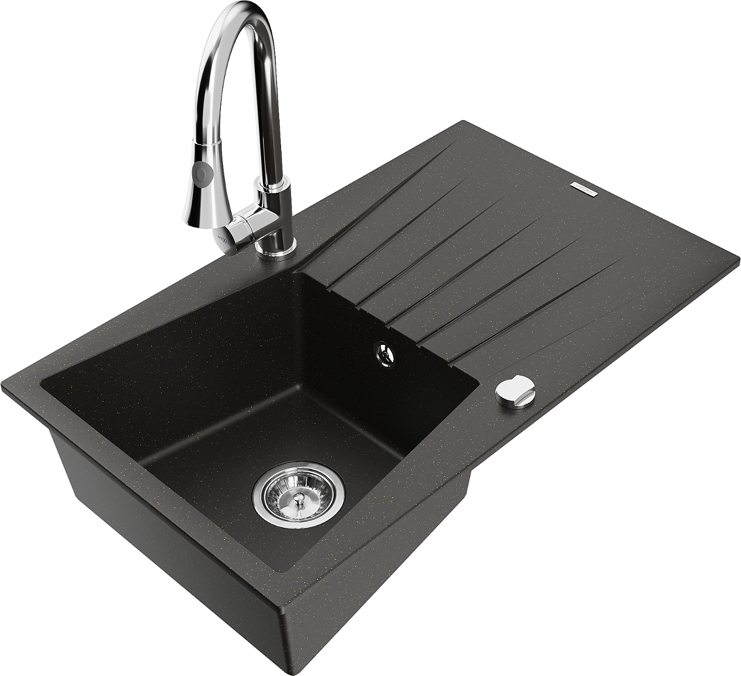 Mexen Cesar zlewozmywak granitowy 1-komorowy z ociekaczem i baterią kuchenną Elia, czarny/złoty metalik - 6514-75-670101-00
