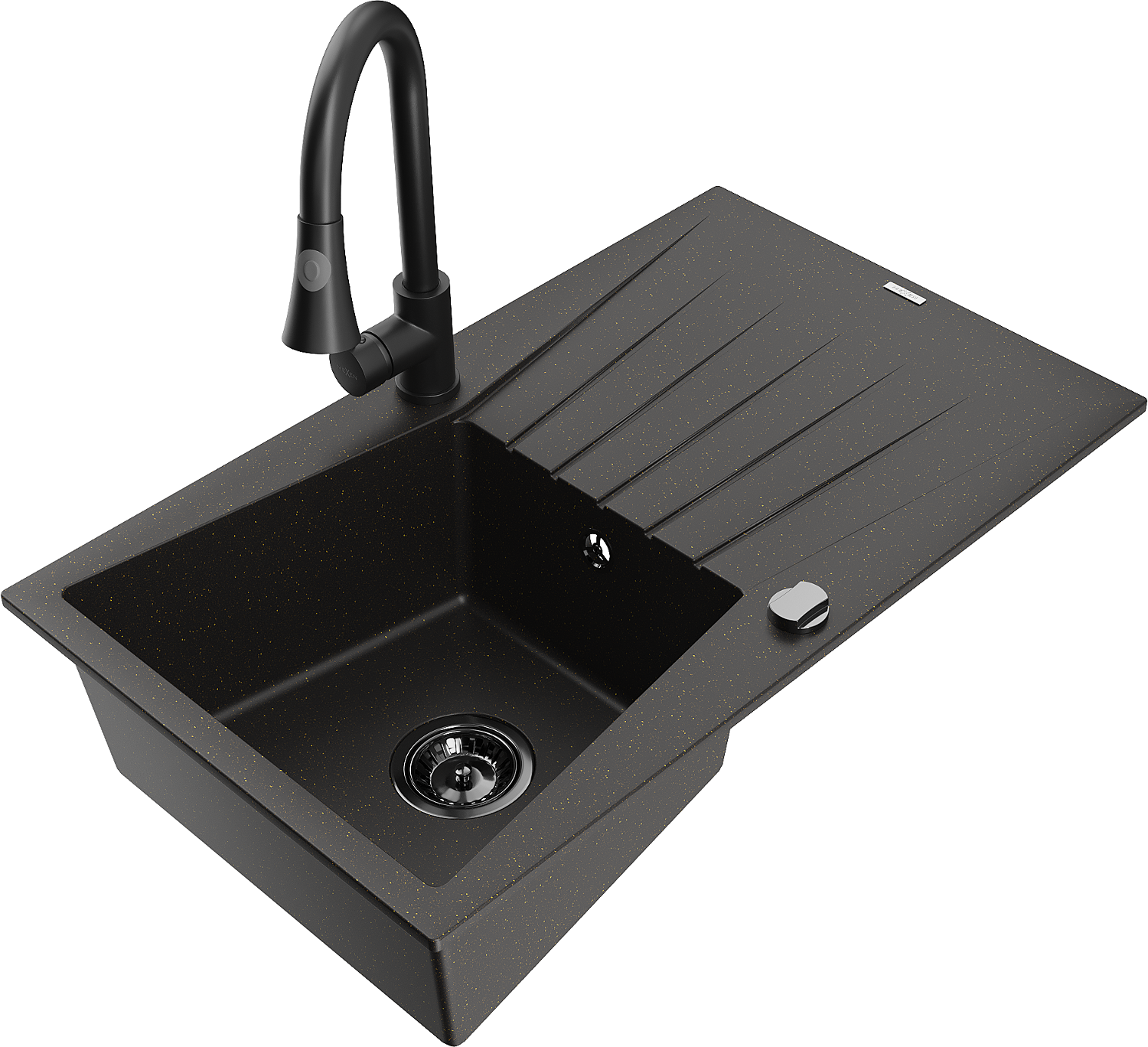 Mexen Cesar zlewozmywak granitowy 1-komorowy z ociekaczem i baterią kuchenną Elia, czarny/złoty metalik - 6514-75-670101-70-B