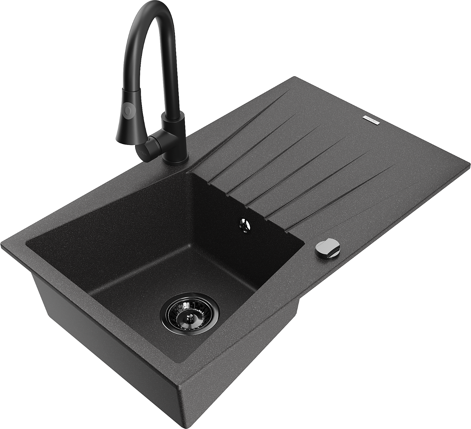 Mexen Cesar zlewozmywak granitowy 1-komorowy z ociekaczem i baterią kuchenną Elia, czarny nakrapiany - 6514-76-670101-70-B