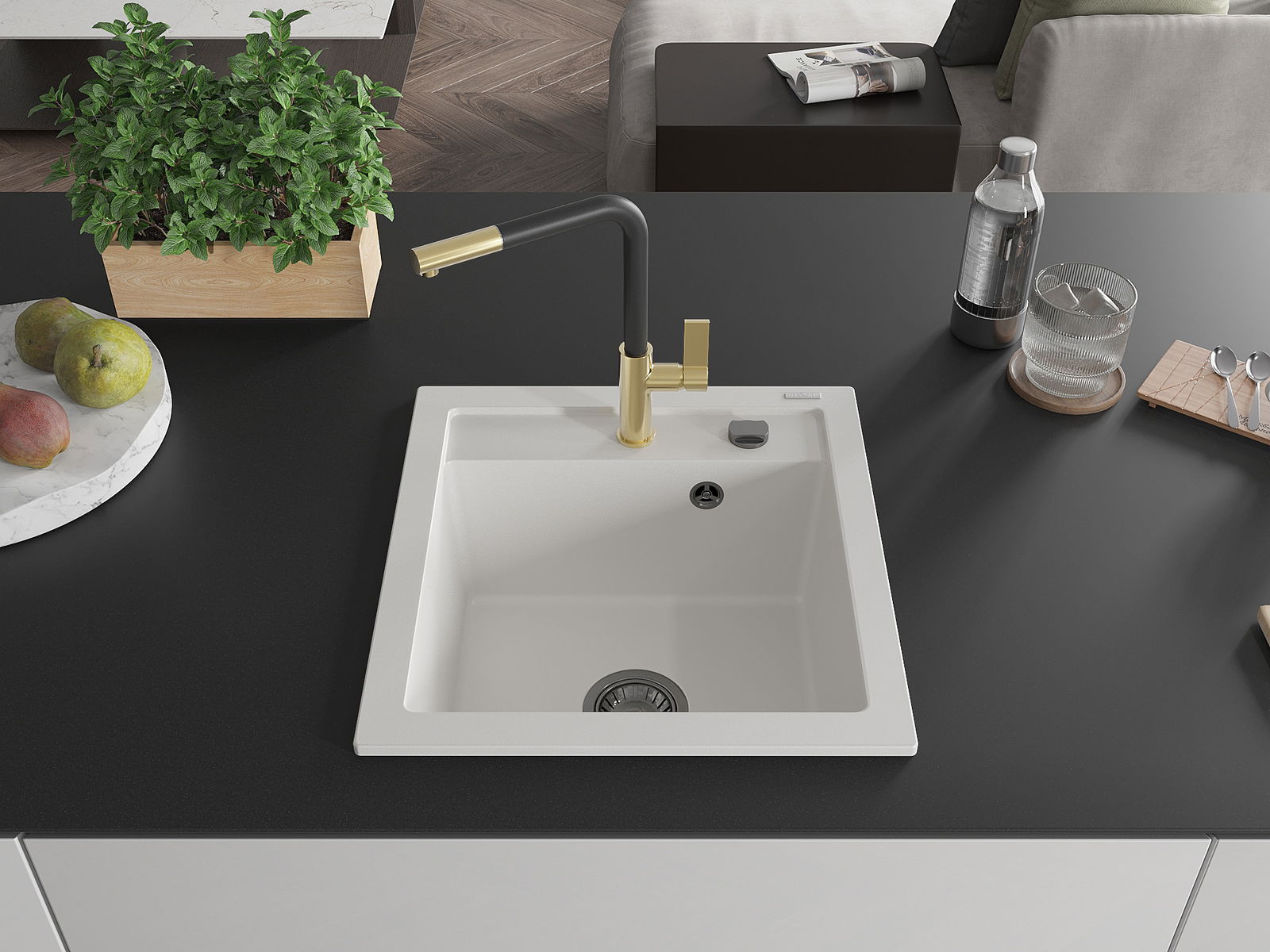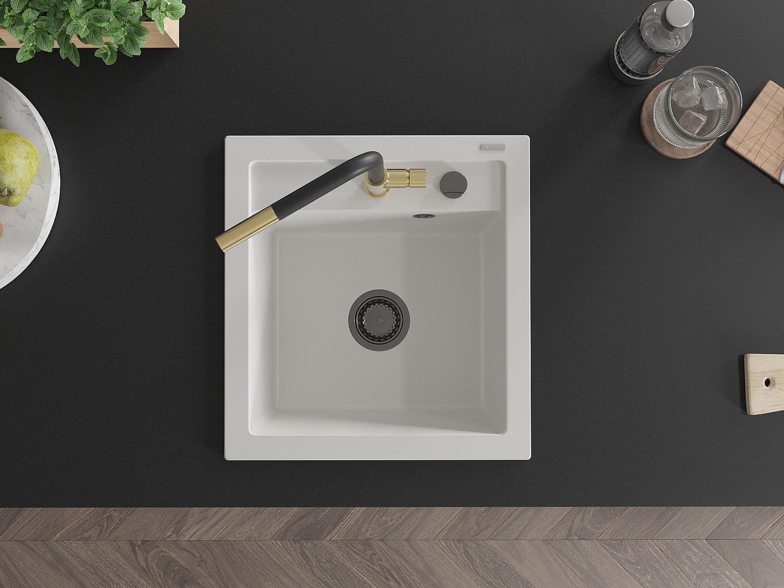 Zlew posiada podfrezowany otwór o średnicy 35 mm do samodzielnego wybicia. Można go wykorzystać m.in. do montażu dozownika na płyn, który wyeliminuje obecność plastikowych butelek w kuchni i nada jej eleganckiego wykończenia.