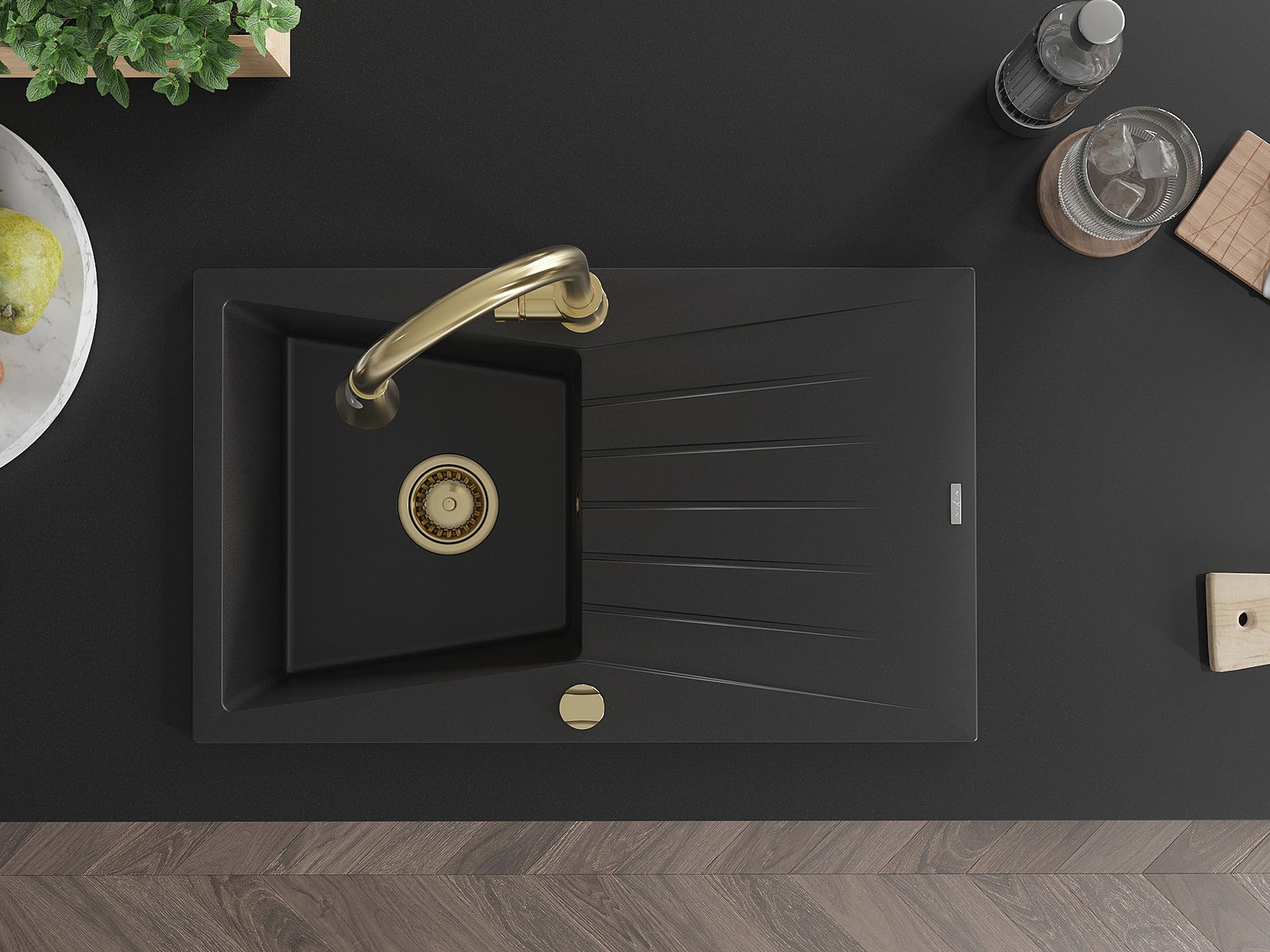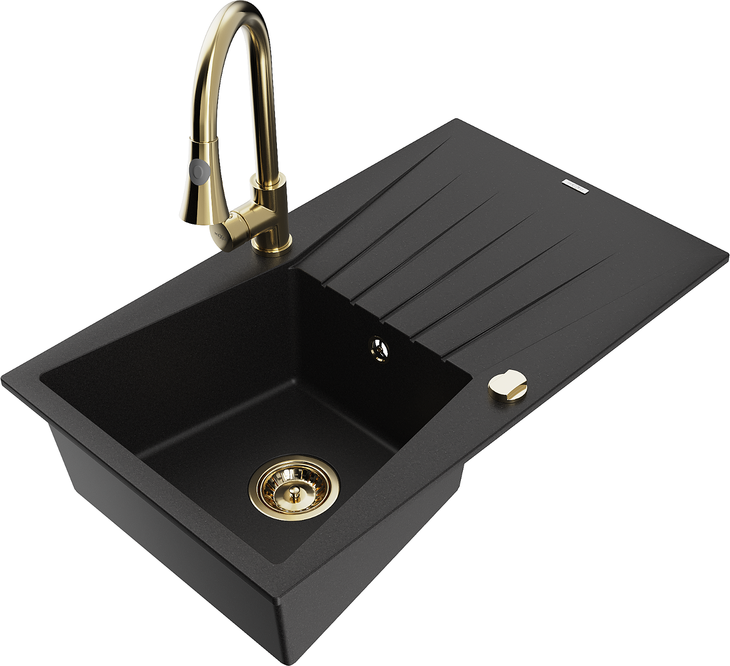 Mexen Cesar zlewozmywak granitowy 1-komorowy z ociekaczem i baterią kuchenną Elia, czarny - 6514-77-670101-50
