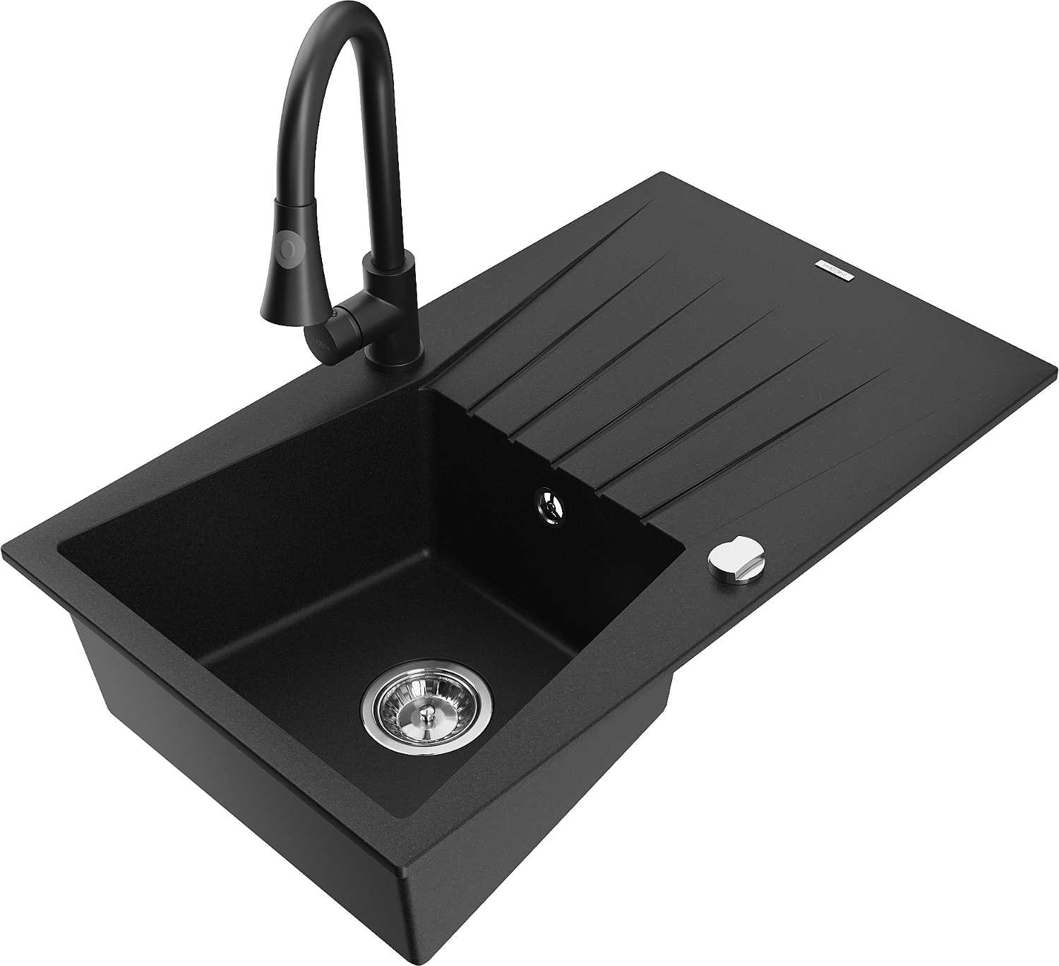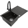 Mexen Cesar zlewozmywak granitowy 1-komorowy z ociekaczem i baterią kuchenną Elia, czarny - 6514-77-670101-70