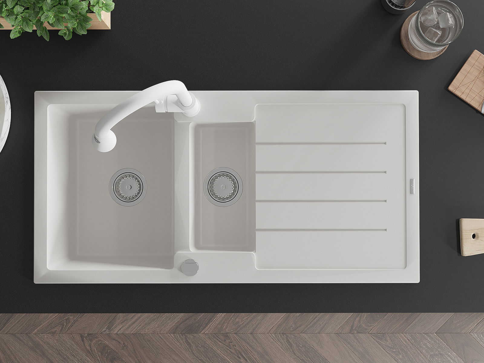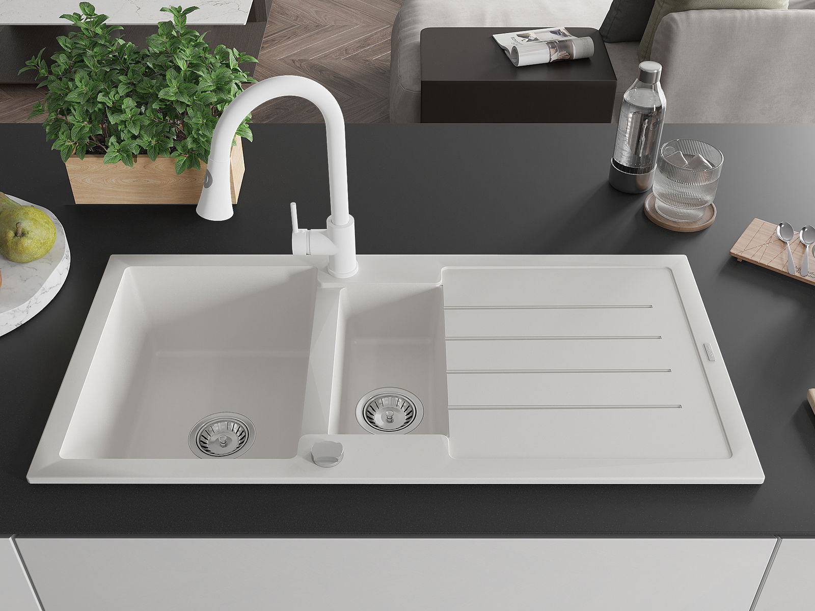 Mexen Andres zlewozmywak granitowy 1,5-komorowy z ociekaczem i baterią kuchenną Elia, biały - 6515-20-670101-20