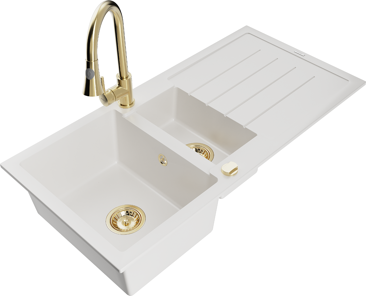 Mexen Andres zlewozmywak granitowy 1,5-komorowy z ociekaczem i baterią kuchenną Elia, biały - 6515-20-670101-50