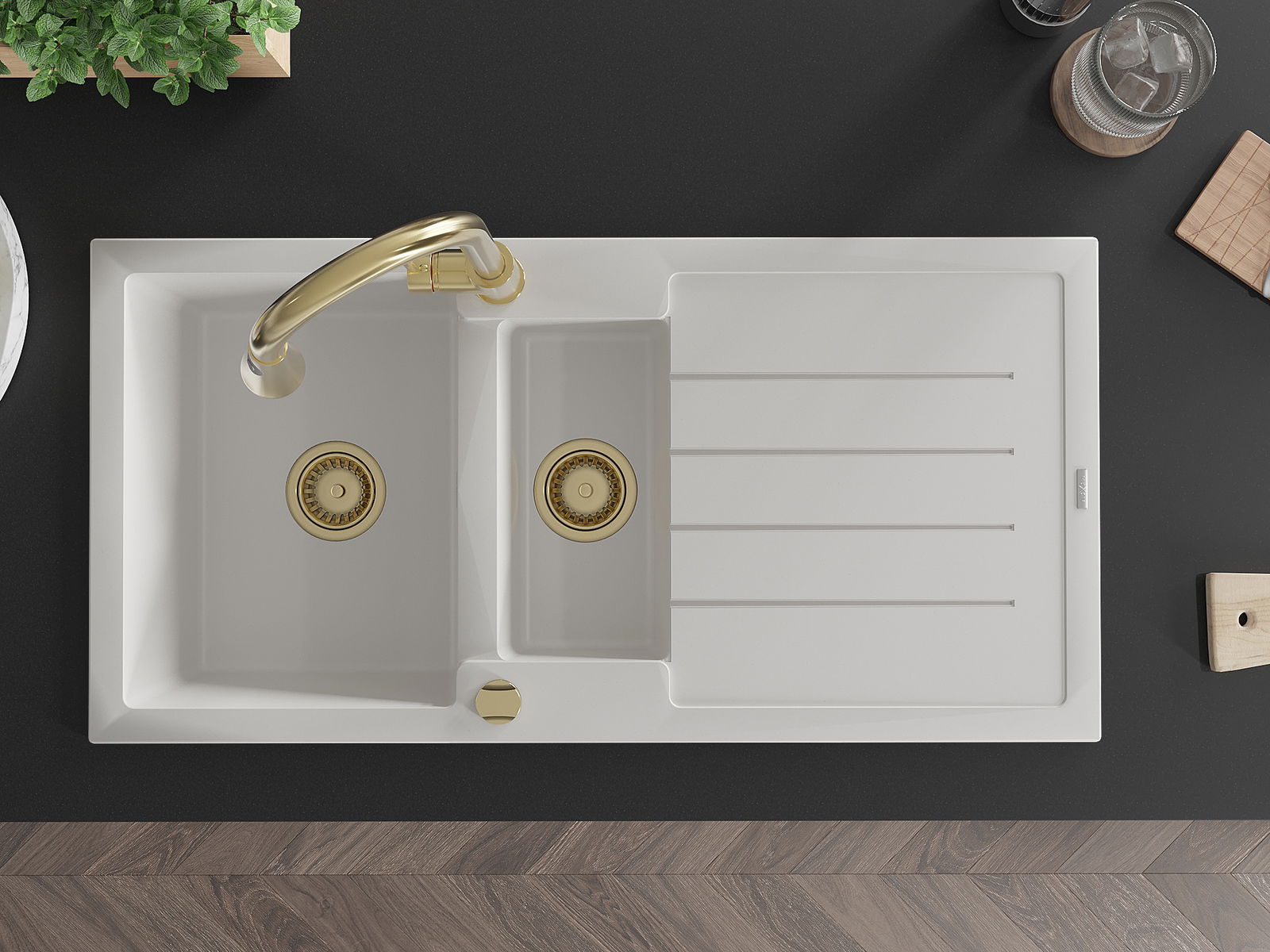 Zlew posiada 2 podfrezowane otwory o średnicy 35 mm, do samodzielnego wybicia. Można je wykorzystać m.in. do montażu dozownika na płyn, który wyeliminuje obecność plastikowych butelek w kuchni i nada jej eleganckiego wykończenia.