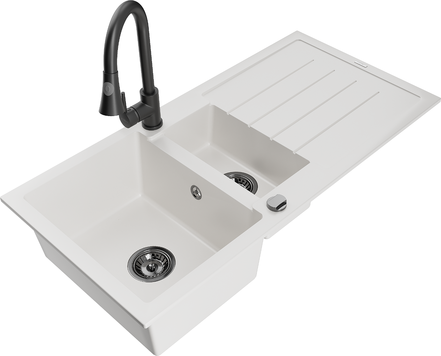 Mexen Andres zlewozmywak granitowy 1,5-komorowy z ociekaczem i baterią kuchenną Elia, biały - 6515-20-670101-70