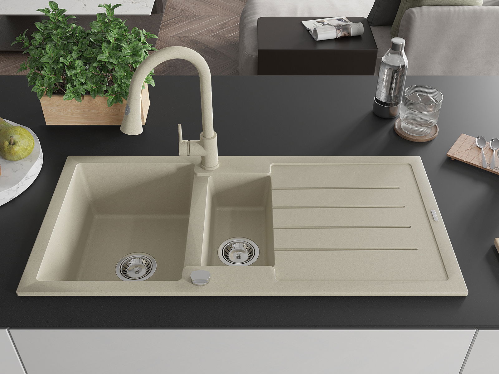 Mexen Andres zlewozmywak granitowy 1,5-komorowy z ociekaczem i baterią kuchenną Elia, beżowy - 6515-69-670101-69