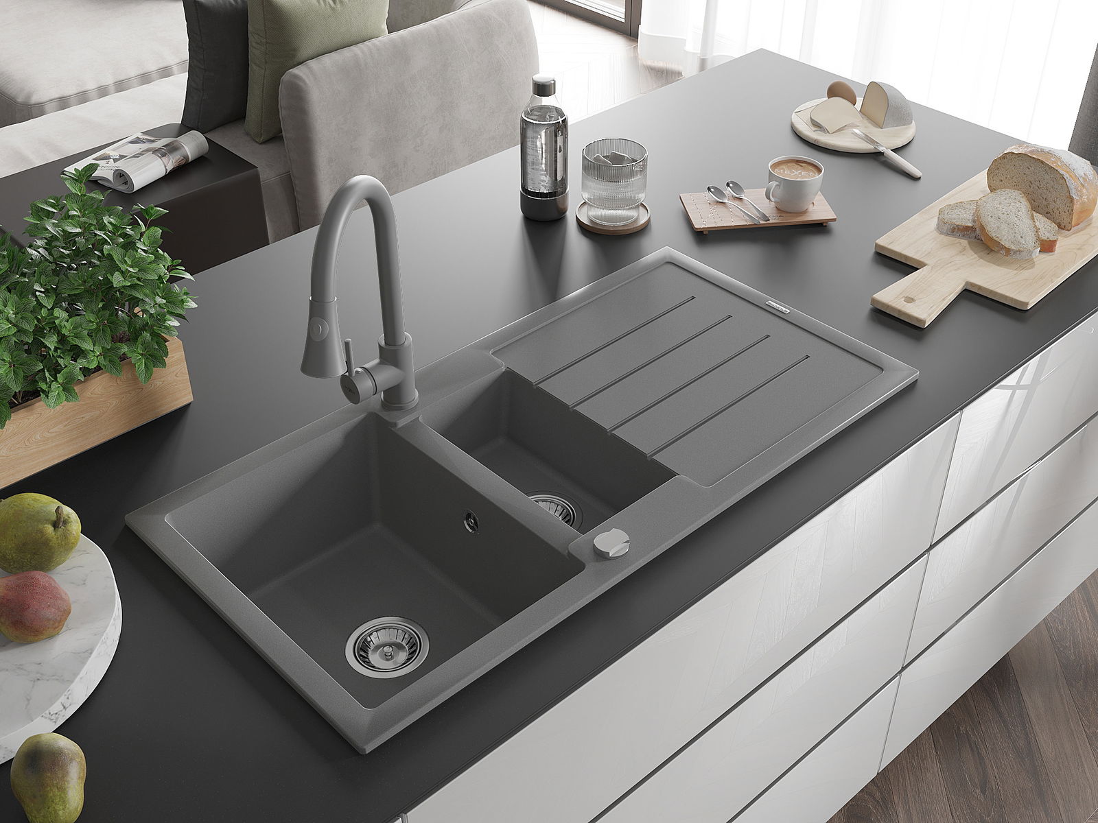 Mexen Andres zlewozmywak granitowy 1,5-komorowy z ociekaczem i baterią kuchenną Elia, szary - 6515-71-670101-71