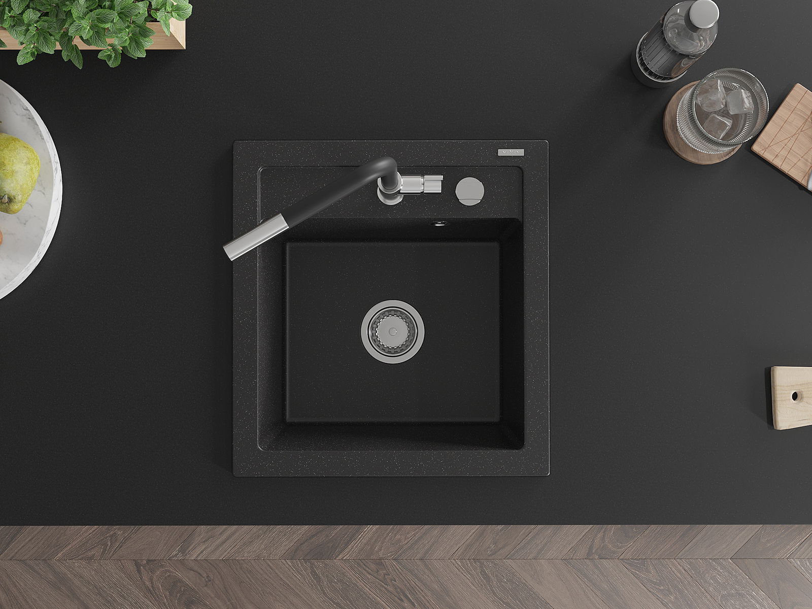 Mexen Vito zlewozmywak granitowy 1-komorowy z baterią kuchenną Flora, czarny/srebrny metalik - 6503-73-670401-07
