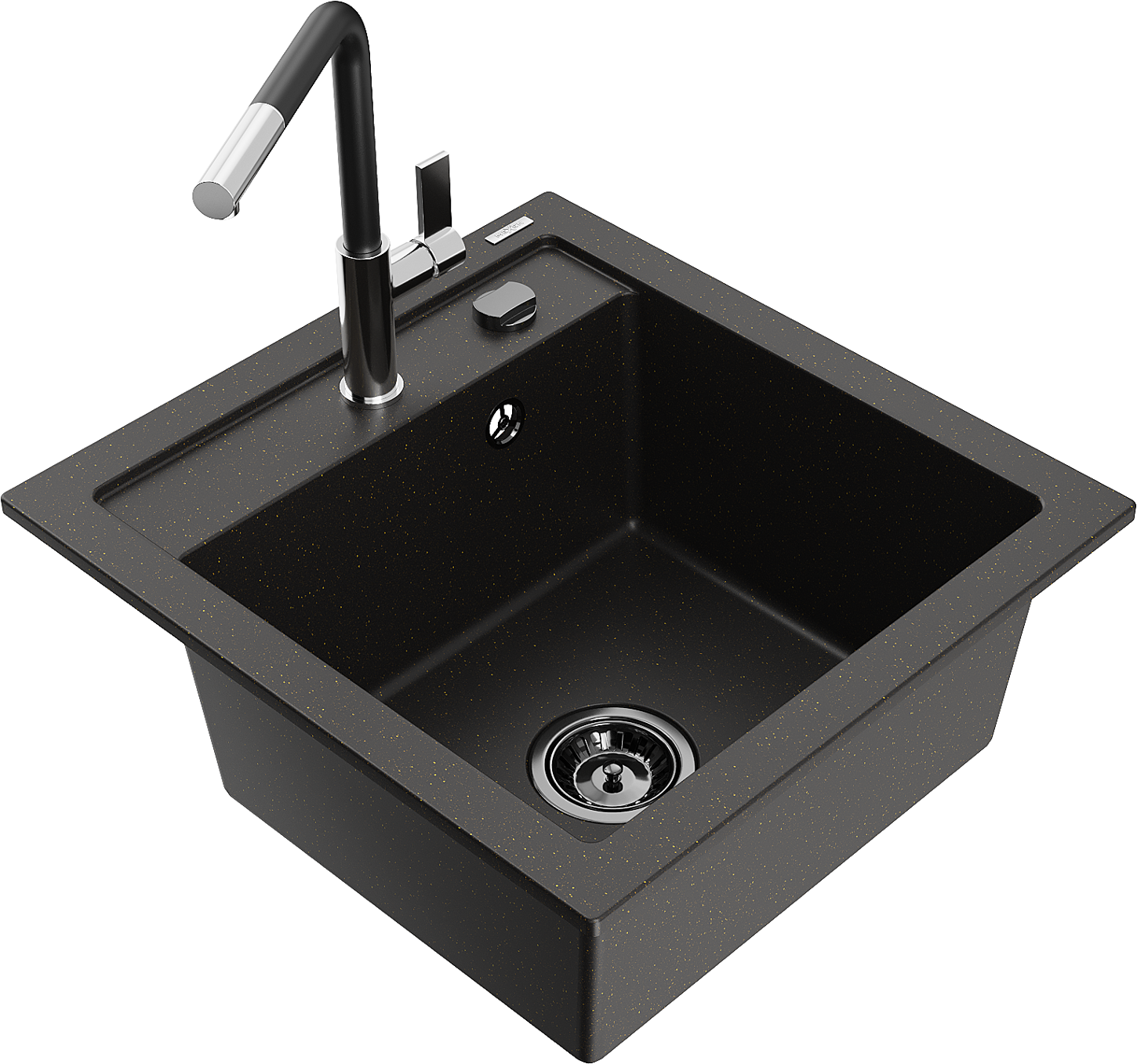 Mexen Vito zlewozmywak granitowy 1-komorowy z baterią kuchenną Flora, czarny/złoty metalik - 6503-75-670401-07-B