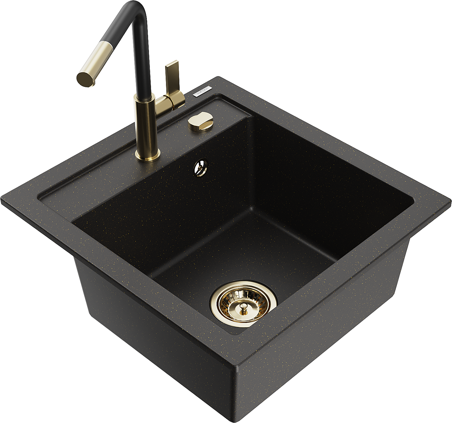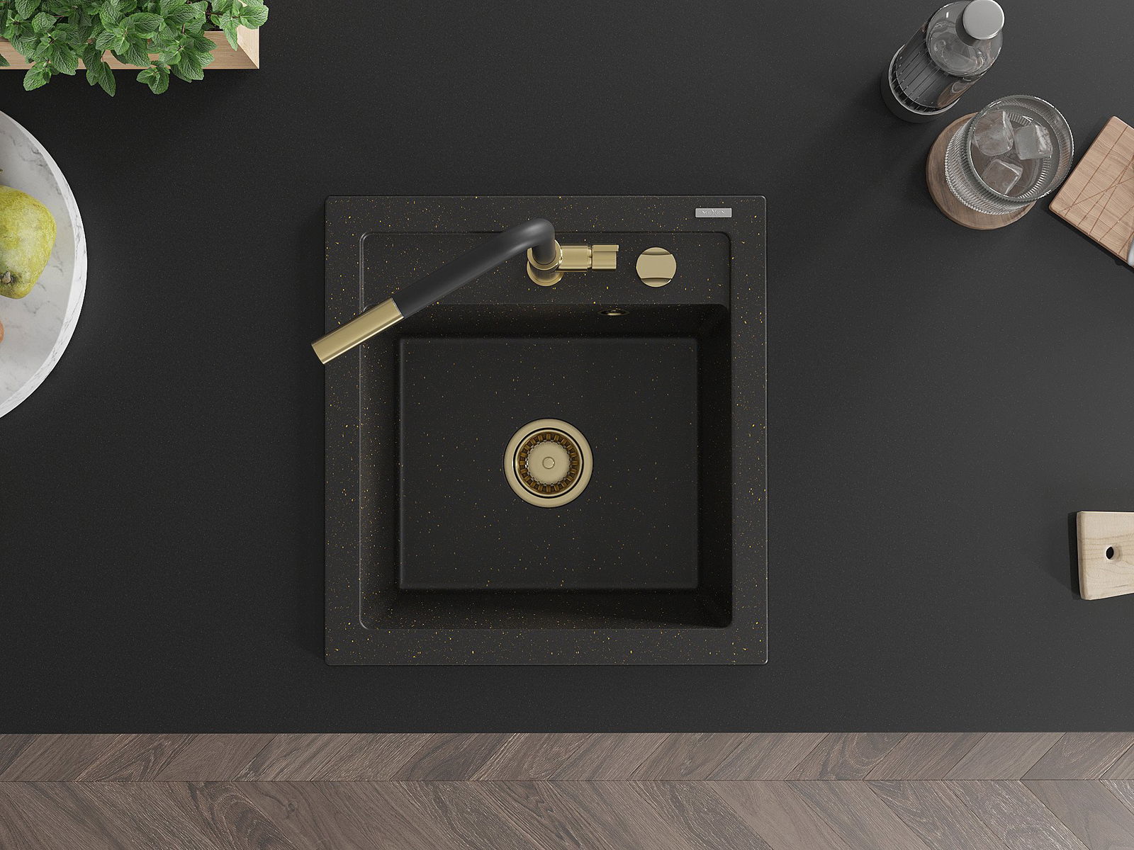 Mexen Vito zlewozmywak granitowy 1-komorowy z baterią kuchenną Flora, czarny/złoty metalik - 6503-75-670401-57-G