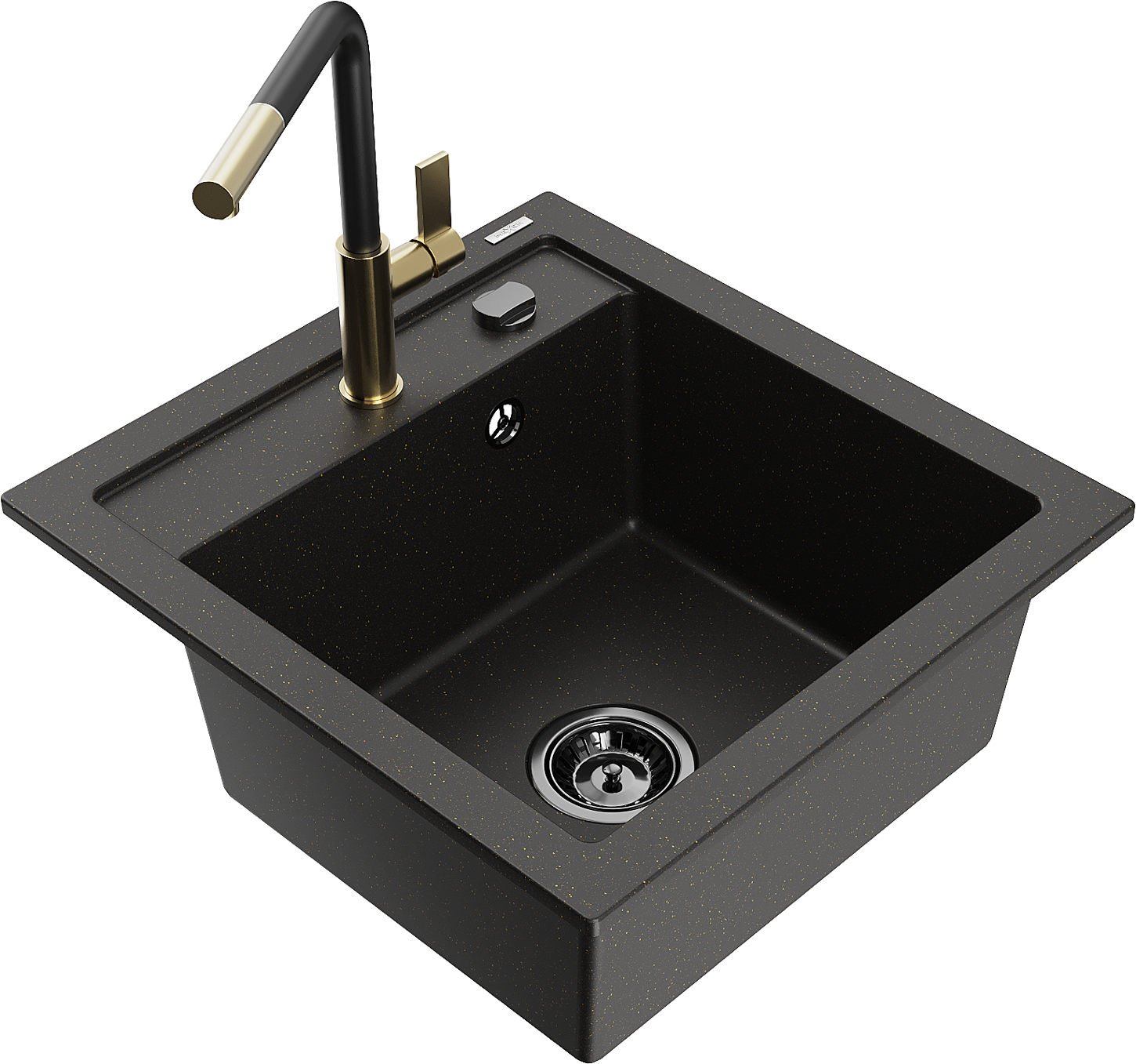 Mexen Vito zlewozmywak granitowy 1-komorowy z baterią kuchenną Flora, czarny/złoty metalik - 6503-75-670401-57-B