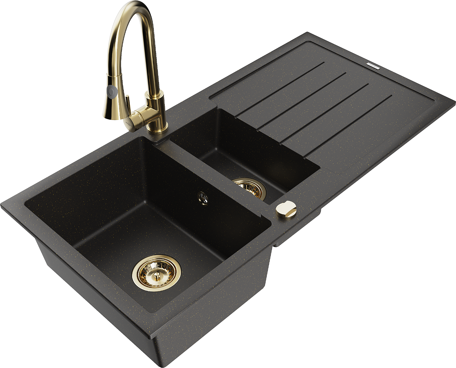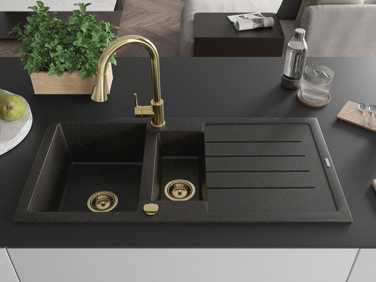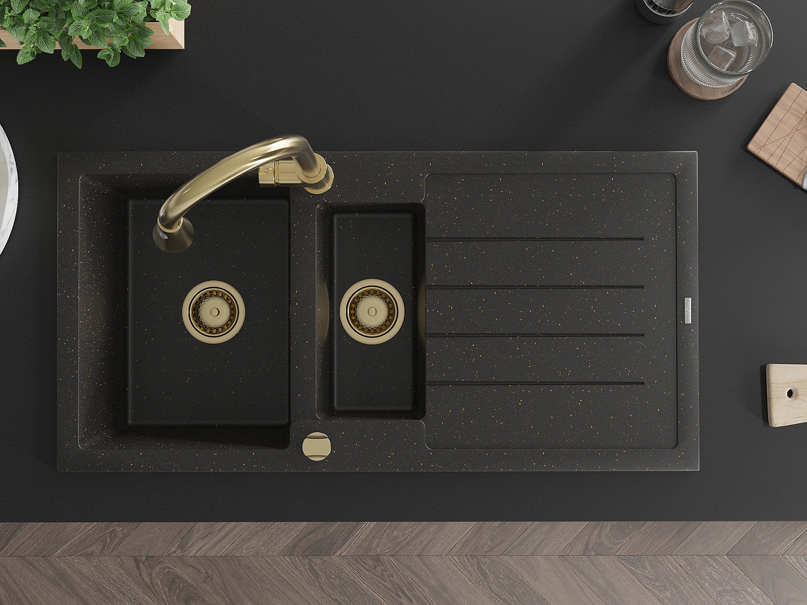 Mexen Andres zlewozmywak granitowy 1,5-komorowy z ociekaczem i baterią kuchenną Elia, czarny/złoty metalik - 6515-75-670101-50