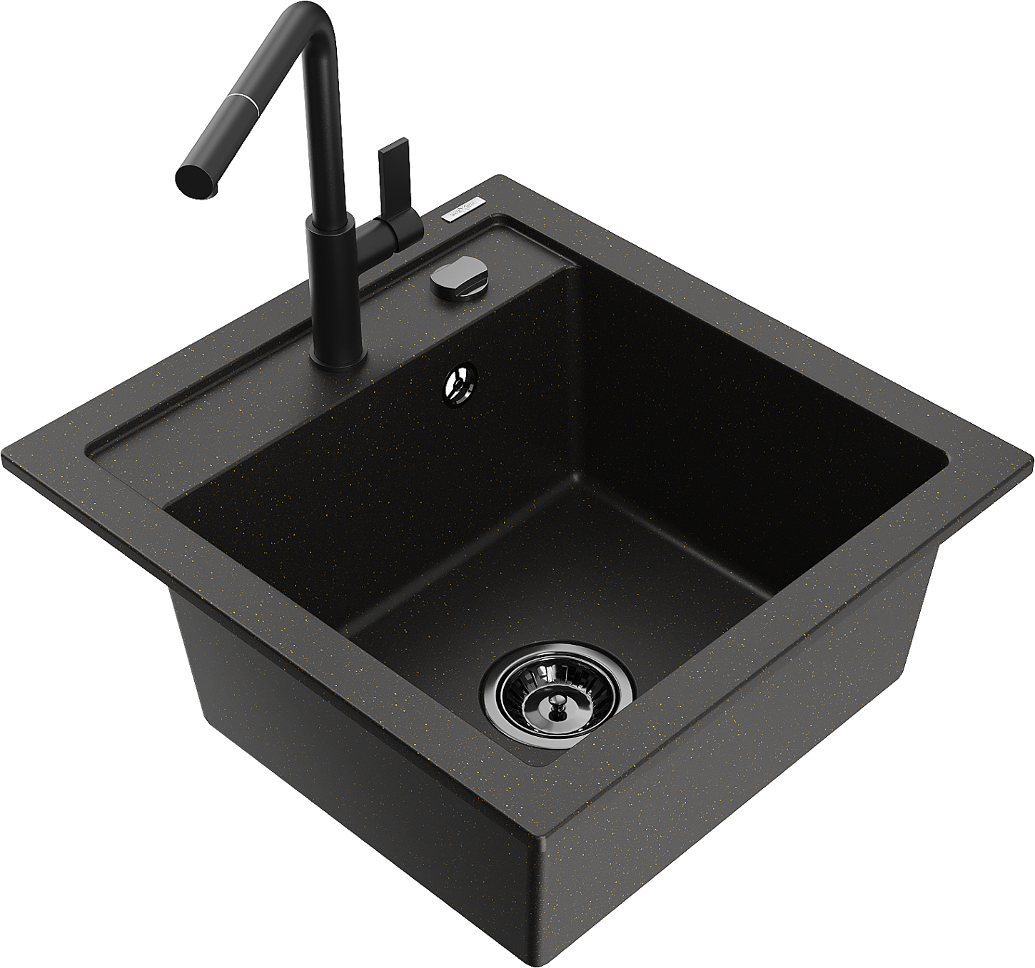 Mexen Vito zlewozmywak granitowy 1-komorowy z baterią kuchenną Flora, czarny/złoty metalik - 6503-75-670401-70-B