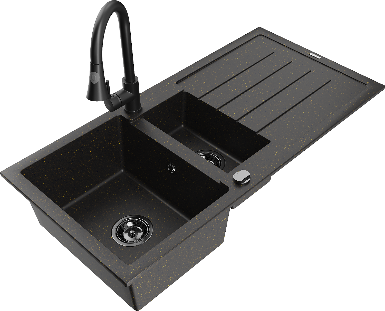 Mexen Andres zlewozmywak granitowy 1,5-komorowy z ociekaczem i baterią kuchenną Elia, czarny/złoty metalik - 6515-75-670101-70-B