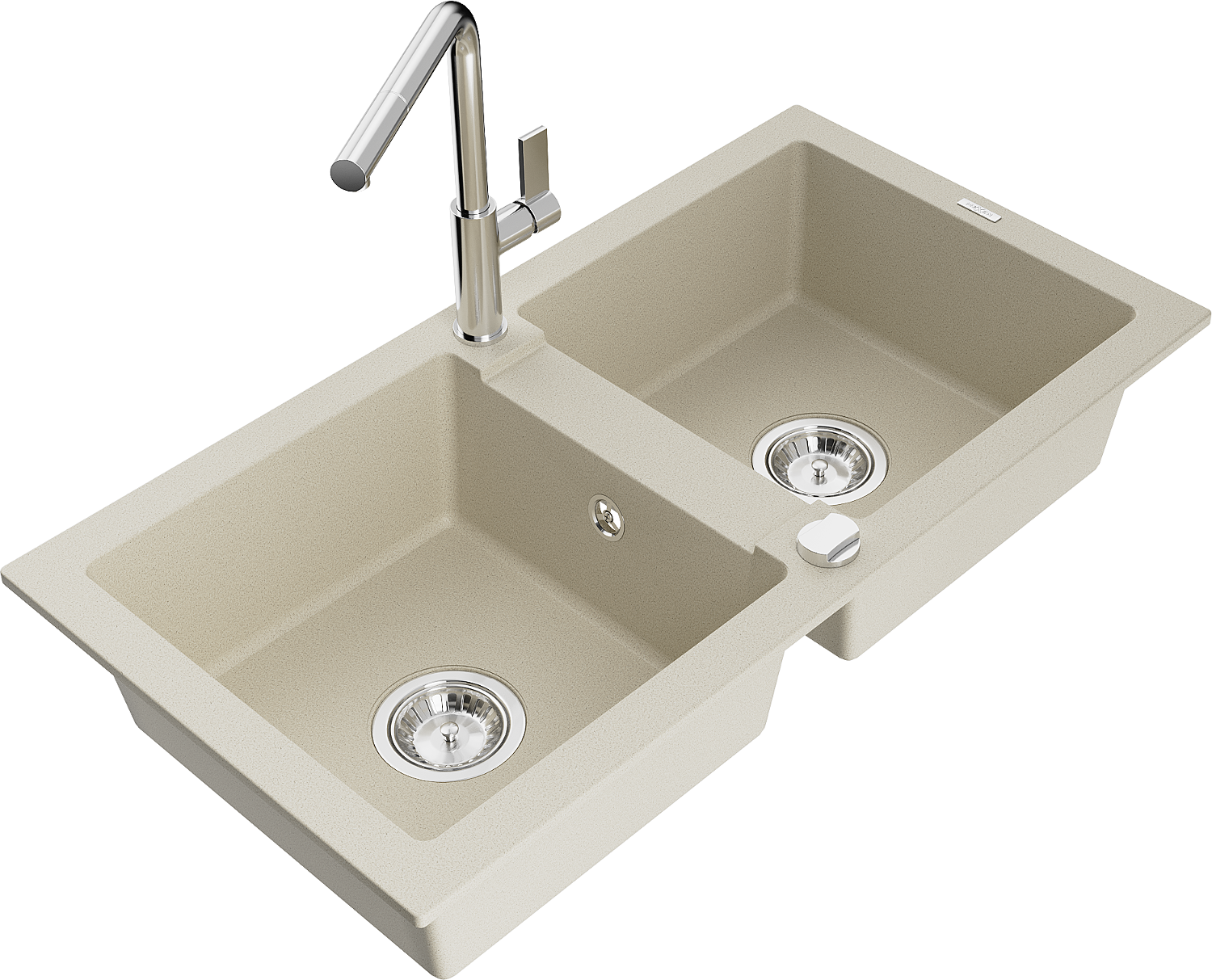 Mexen Mario zlewozmywak granitowy 2-komorowy z baterią kuchenną Flora, beżowy - 6504-69-670401-00