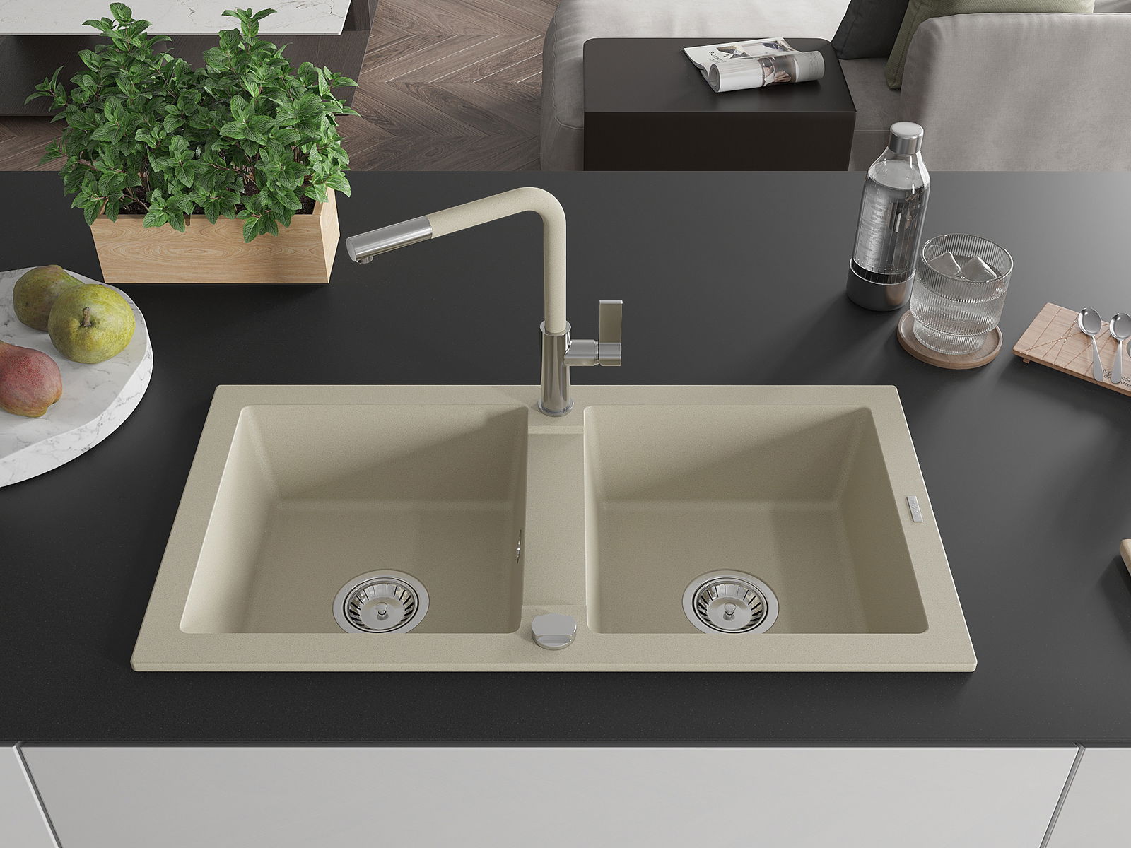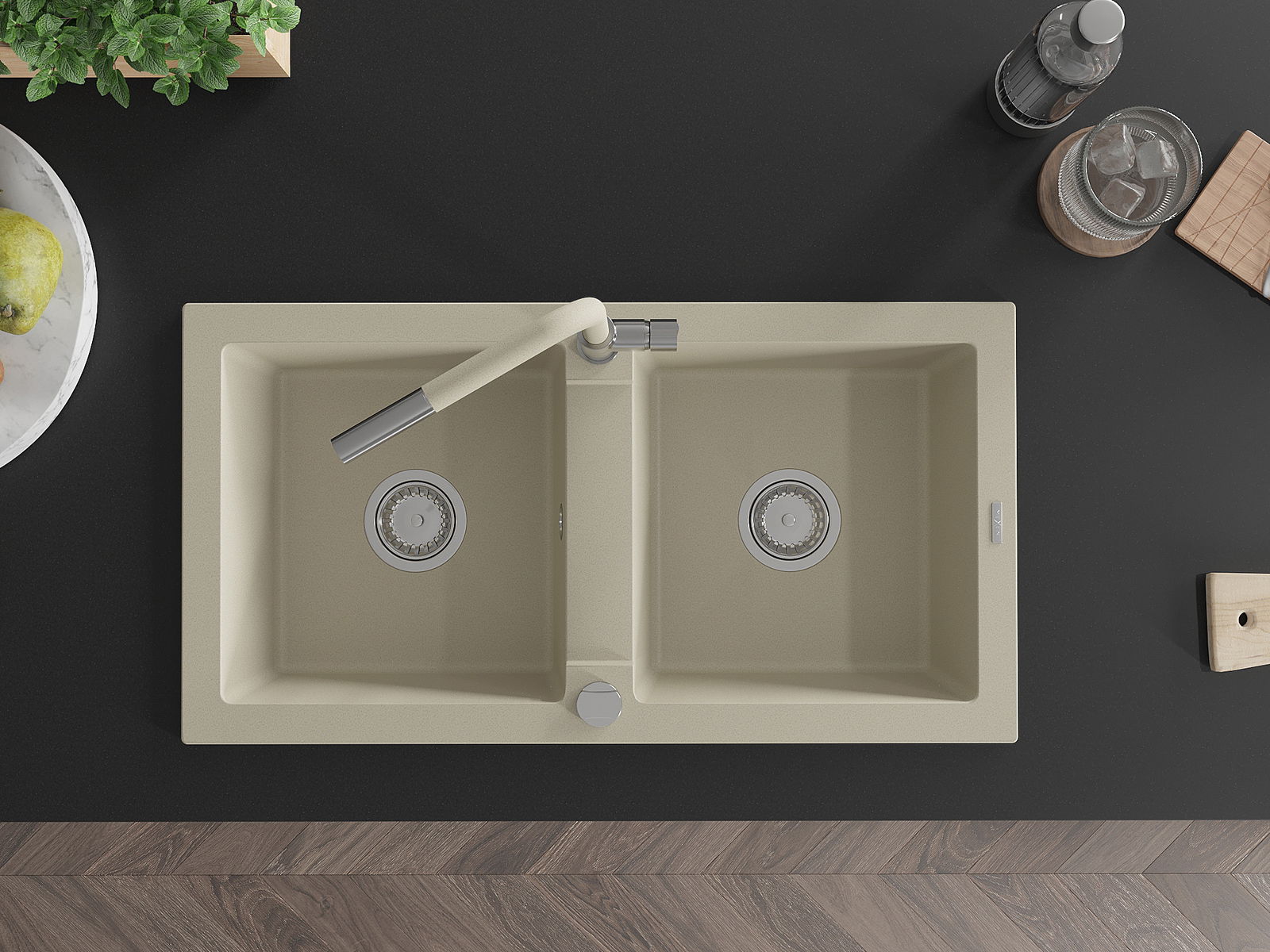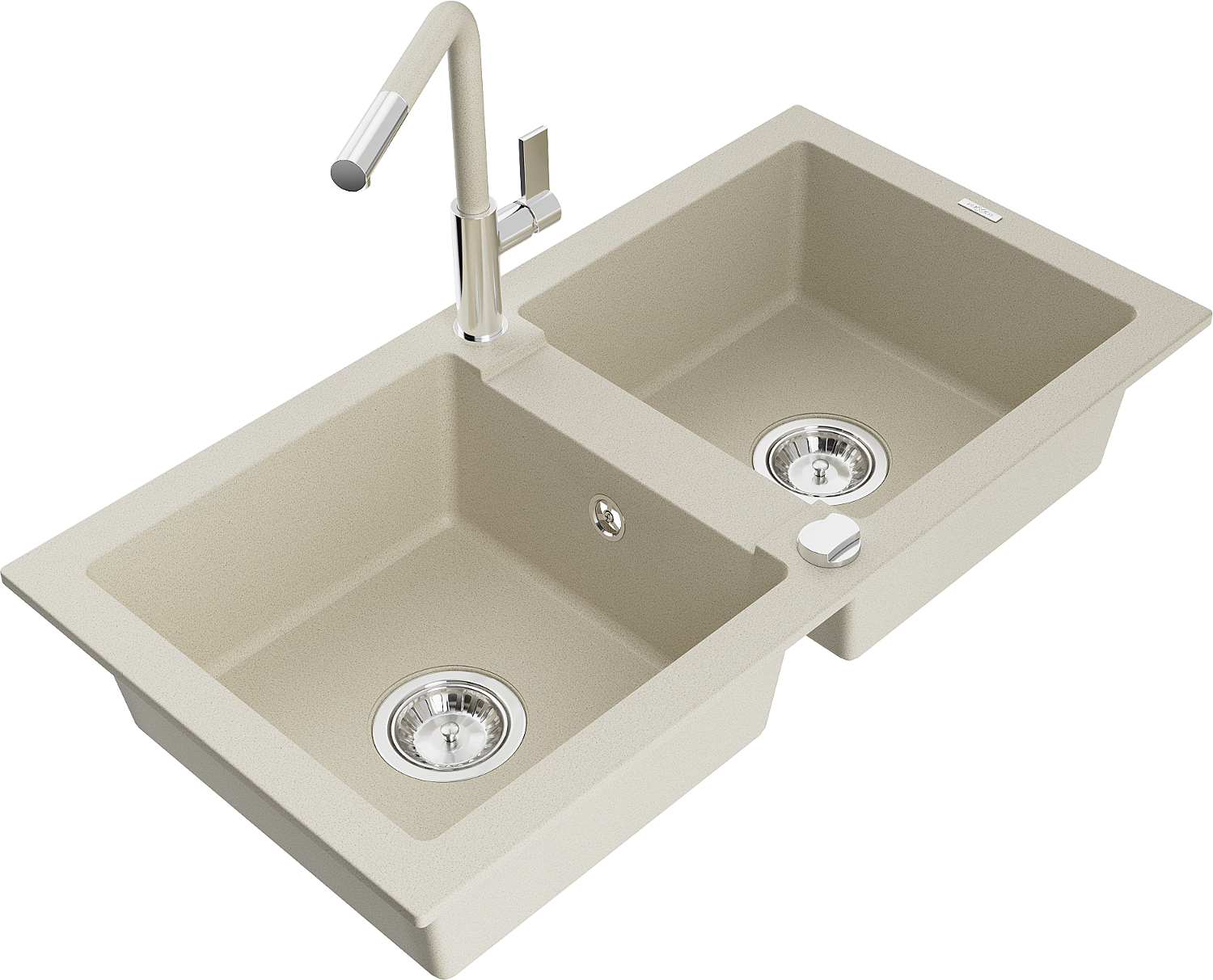 Mexen Mario zlewozmywak granitowy 2-komorowy z baterią kuchenną Flora, beżowy - 6504-69-670401-09