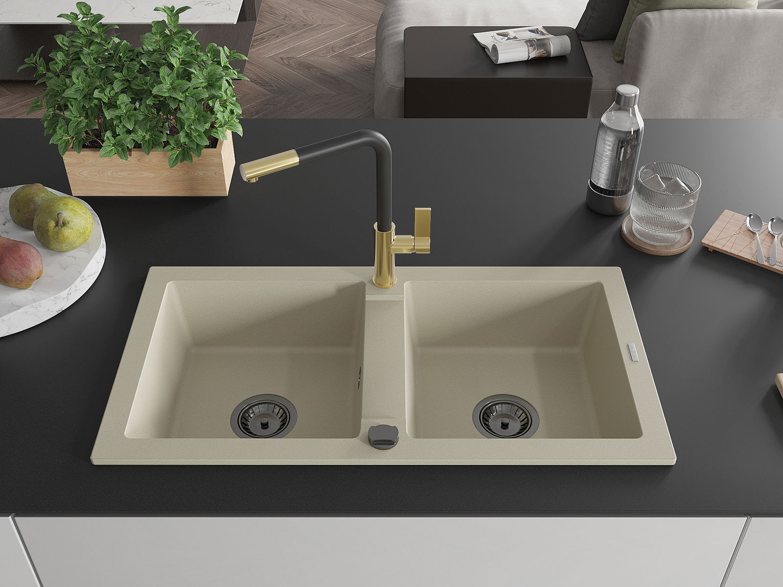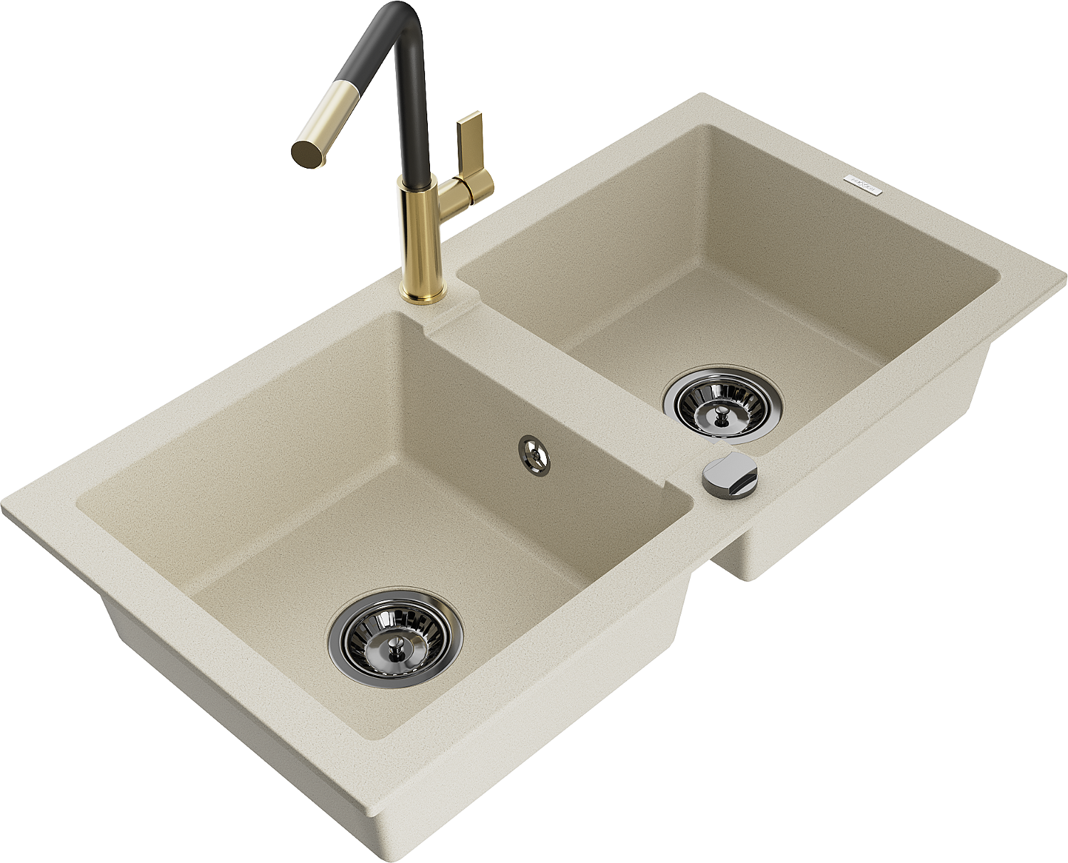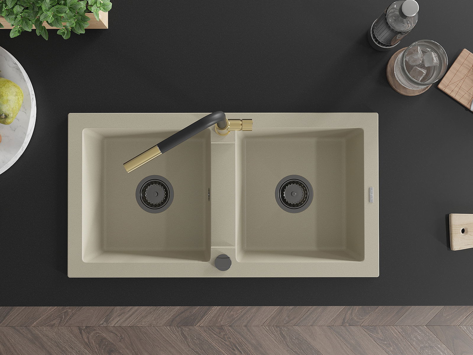 Mexen Mario zlewozmywak granitowy 2-komorowy z baterią kuchenną Flora, beżowy - 6504-69-670401-57-B