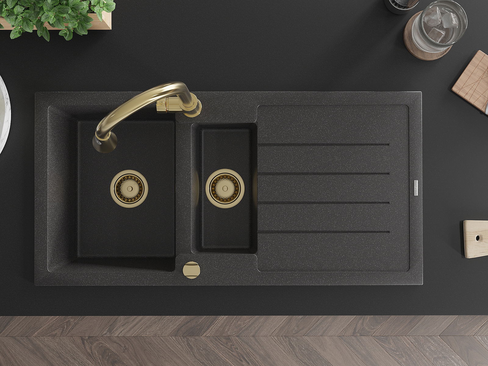 Zlew posiada 2 podfrezowane otwory o średnicy 35 mm, do samodzielnego wybicia. Można je wykorzystać m.in. do montażu dozownika na płyn, który wyeliminuje obecność plastikowych butelek w kuchni i nada jej eleganckiego wykończenia.