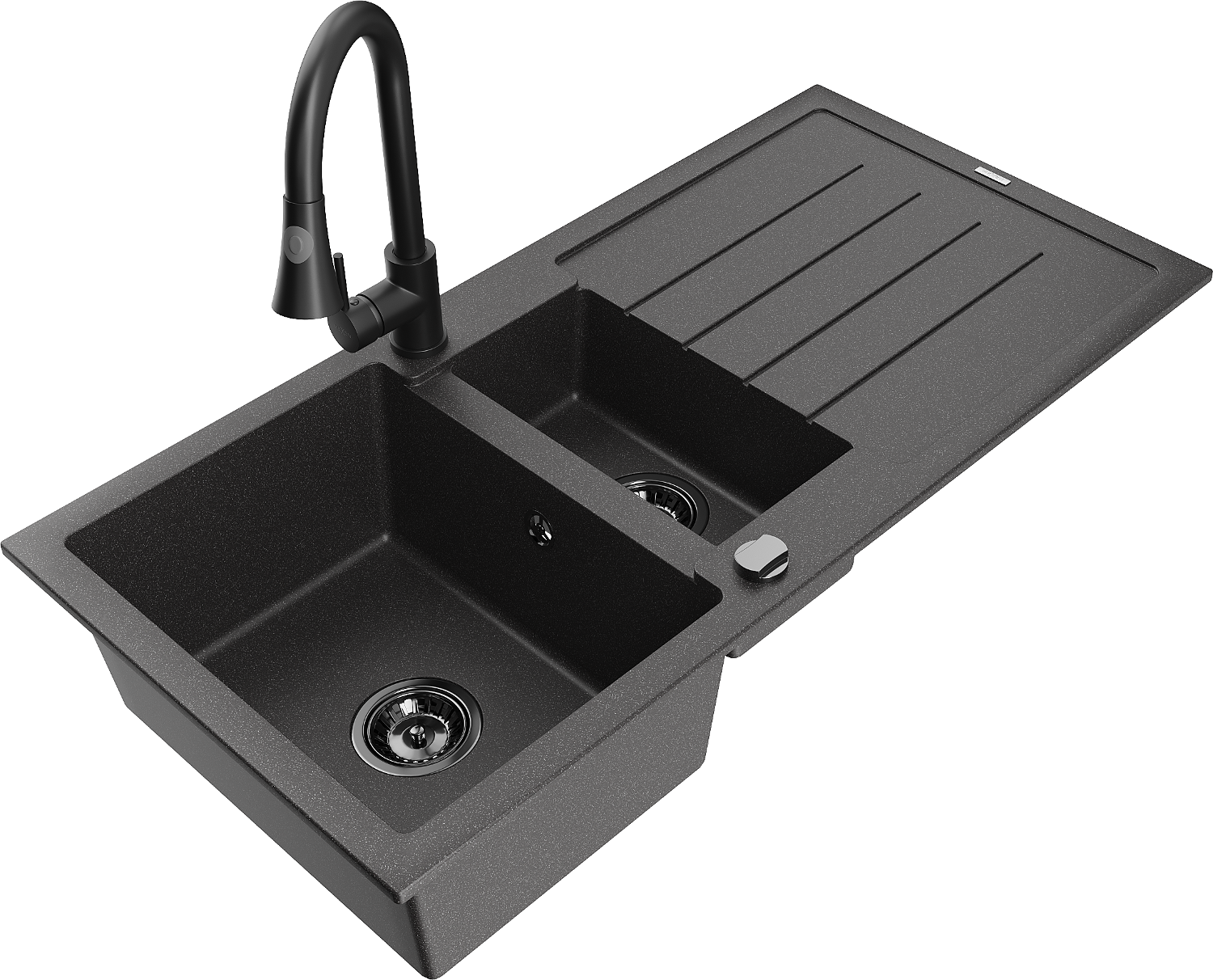 Mexen Andres zlewozmywak granitowy 1,5-komorowy z ociekaczem i baterią kuchenną Elia, czarny nakrapiany - 6515-76-670101-70-B