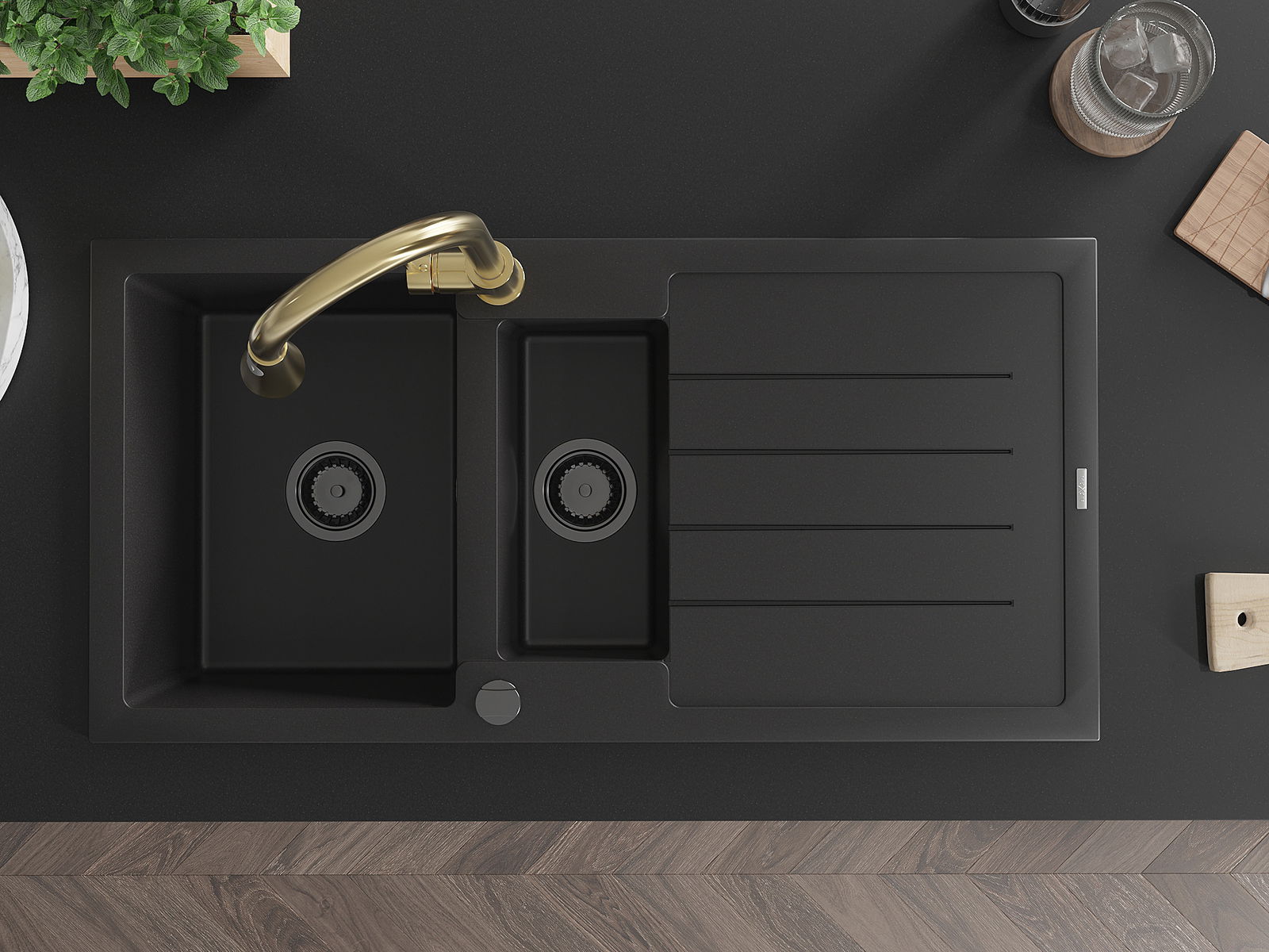 Zlew posiada 2 podfrezowane otwory o średnicy 35 mm, do samodzielnego wybicia. Można je wykorzystać m.in. do montażu dozownika na płyn, który wyeliminuje obecność plastikowych butelek w kuchni i nada jej eleganckiego wykończenia.
