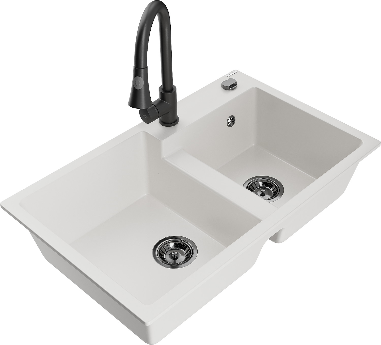 Mexen Tomas zlewozmywak granitowy 2-komorowy z baterią kuchenną Elia, biały - 6516-20-670101-70