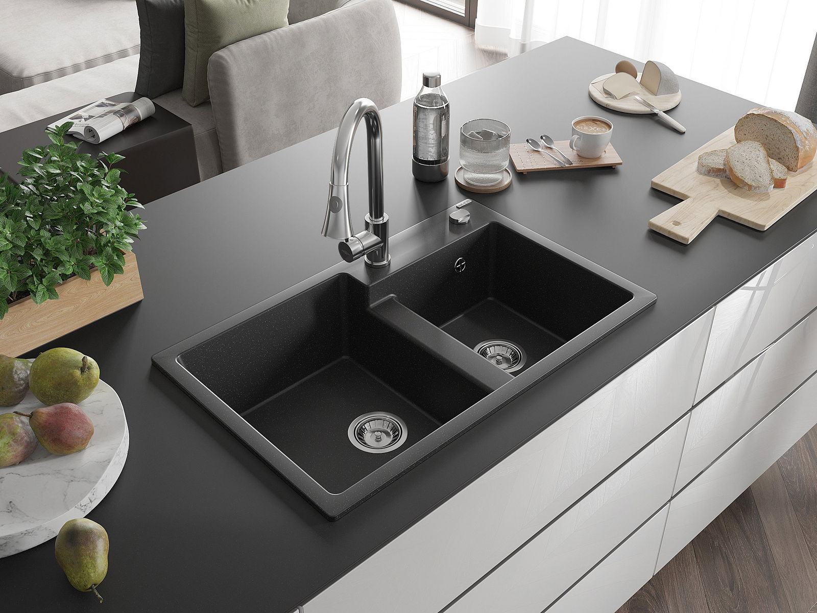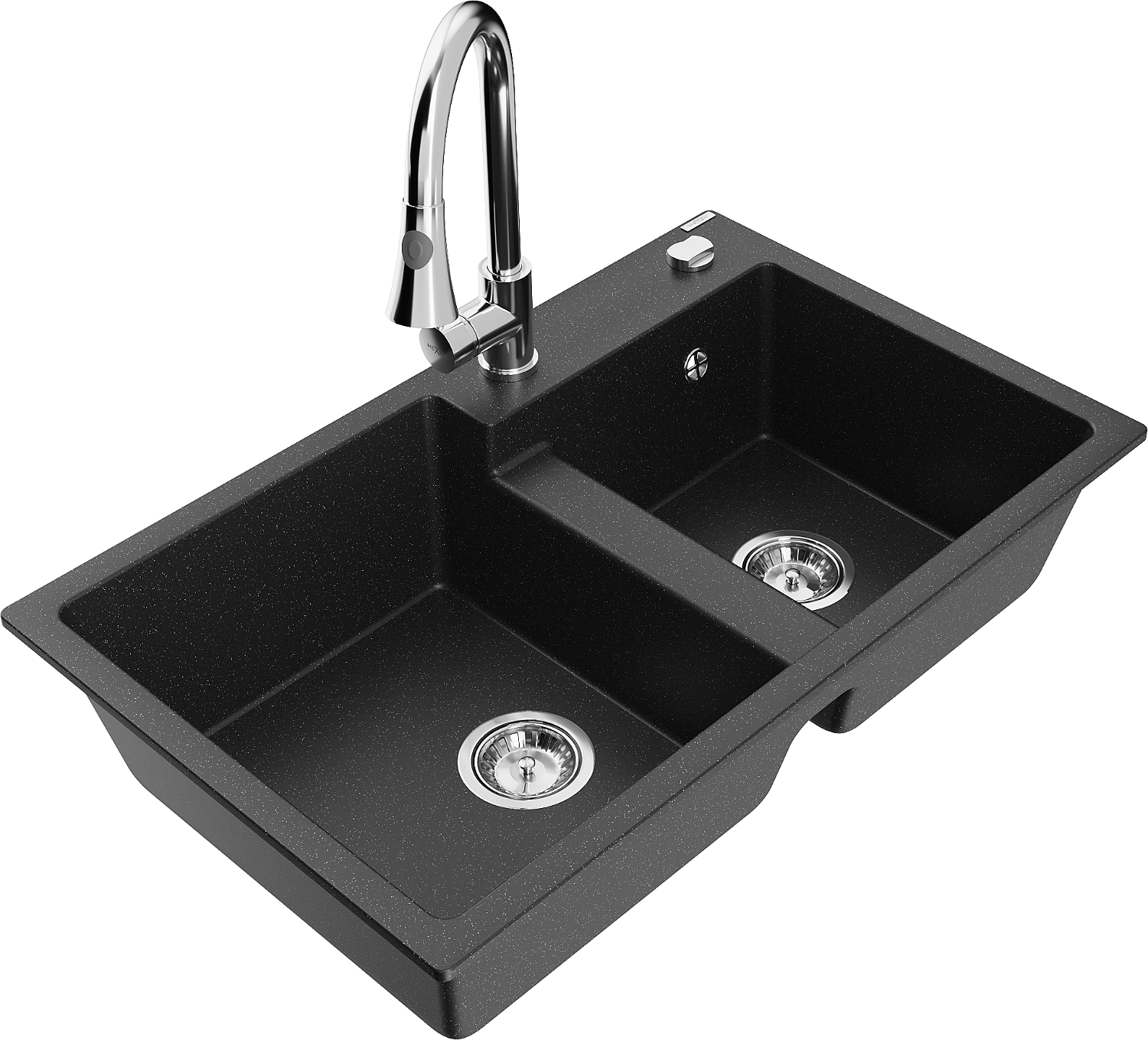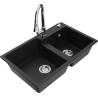 Mexen Tomas zlewozmywak granitowy 2-komorowy z baterią kuchenną Elia, czarny/srebrny metalik - 6516-73-670101-00