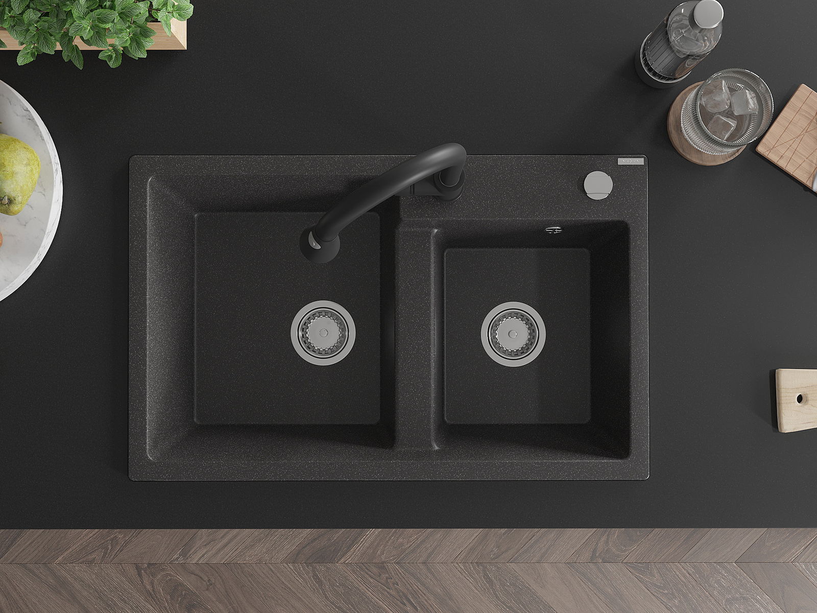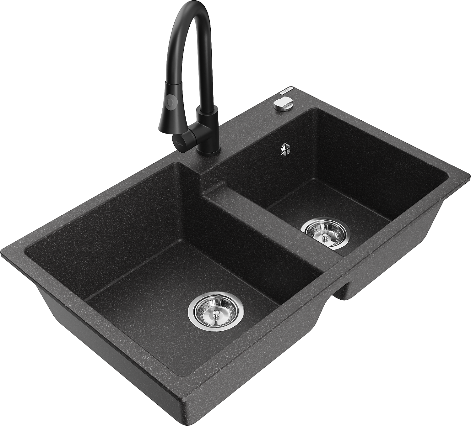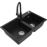 Mexen Tomas zlewozmywak granitowy 2-komorowy z baterią kuchenną Elia, czarny nakrapiany - 6516-76-670101-70