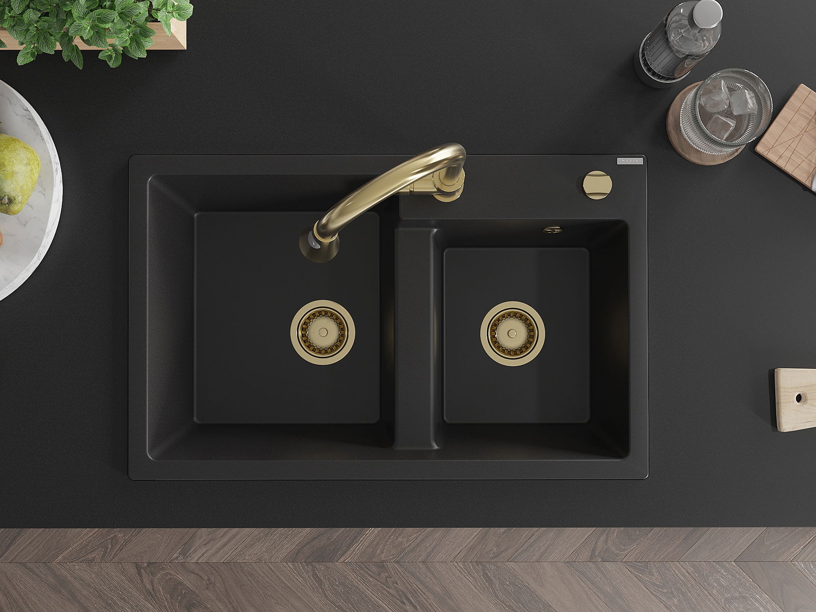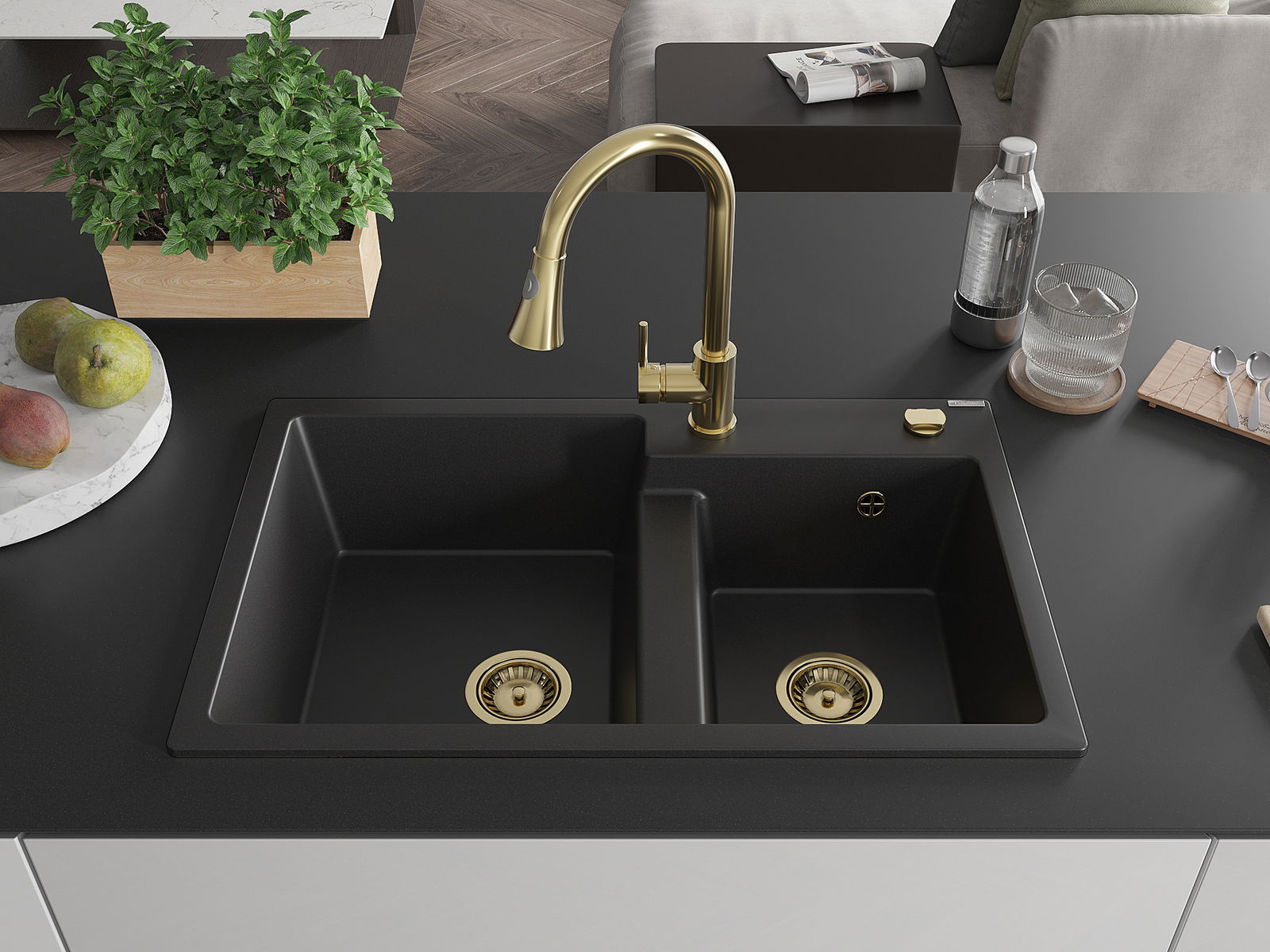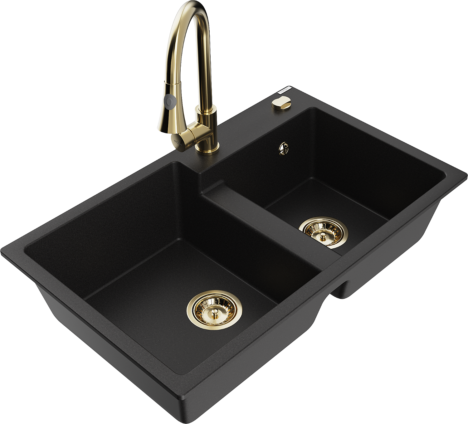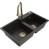 Mexen Tomas zlewozmywak granitowy 2-komorowy z baterią kuchenną Elia, czarny - 6516-77-670101-50