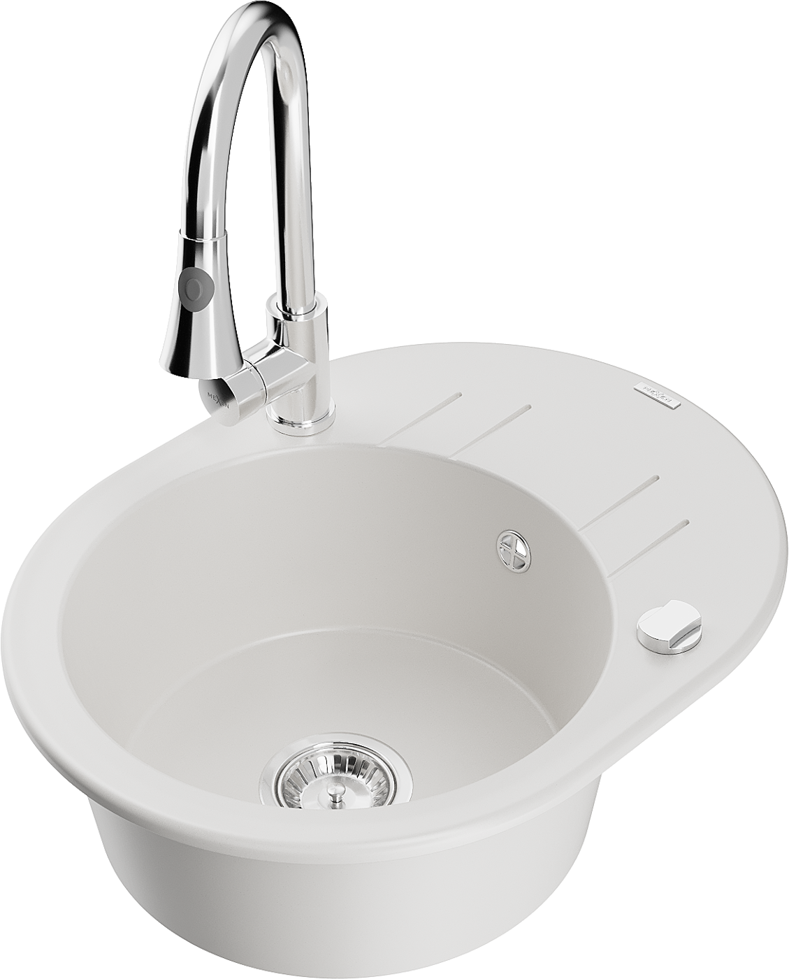 Mexen Kevin zlewozmywak granitowy 1-komorowy z ociekaczem i baterią kuchenną Elia, biały - 6517-20-670101-00