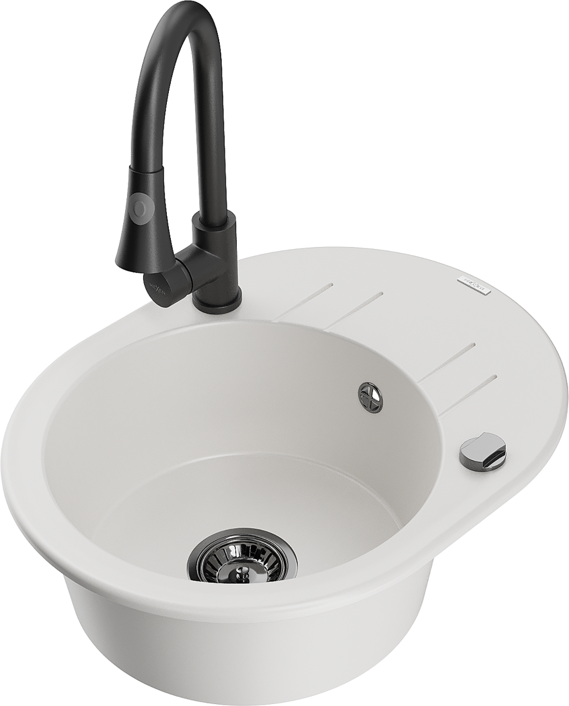 Mexen Kevin zlewozmywak granitowy 1-komorowy z ociekaczem i baterią kuchenną Elia, biały - 6517-20-670101-70