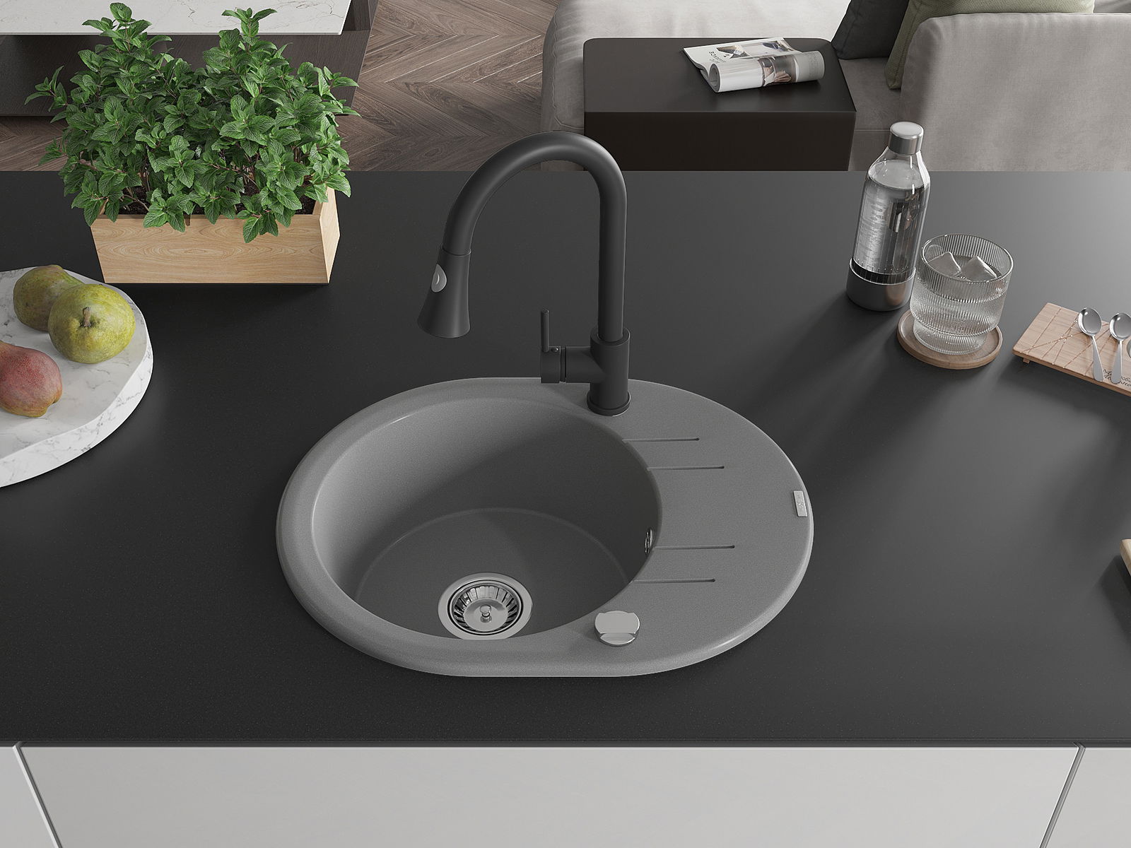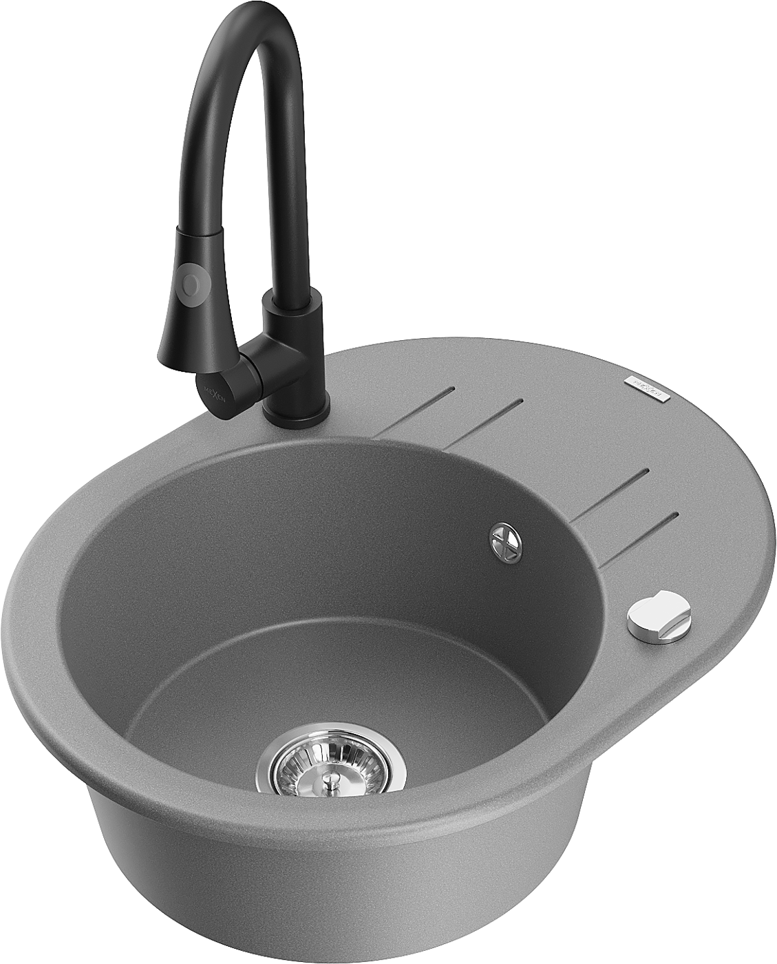 Mexen Kevin zlewozmywak granitowy 1-komorowy z ociekaczem i baterią kuchenną Elia, szary - 6517-71-670101-70
