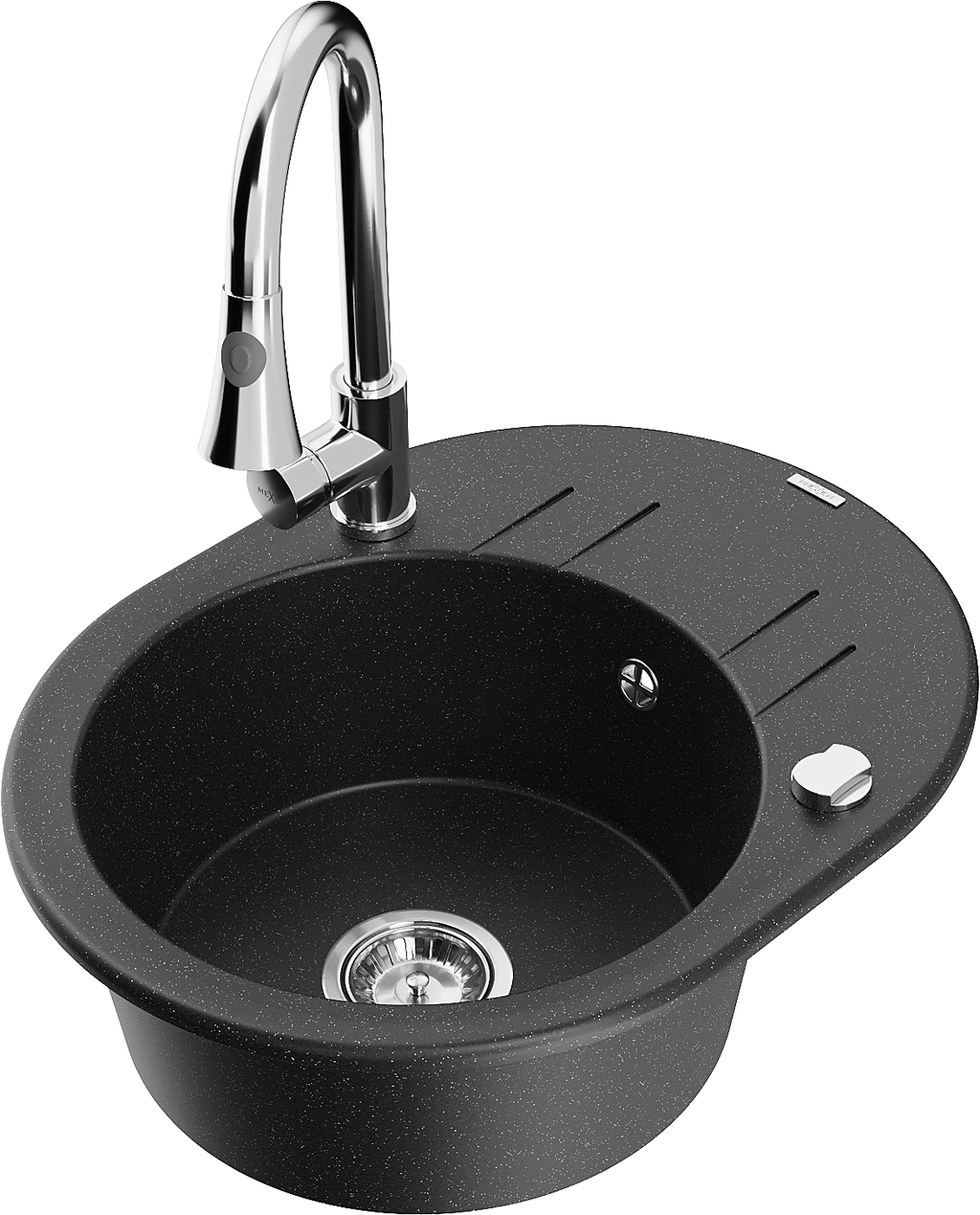 Mexen Kevin zlewozmywak granitowy 1-komorowy z ociekaczem i baterią kuchenną Elia, czarny/srebrny metalik - 6517-73-670101-00