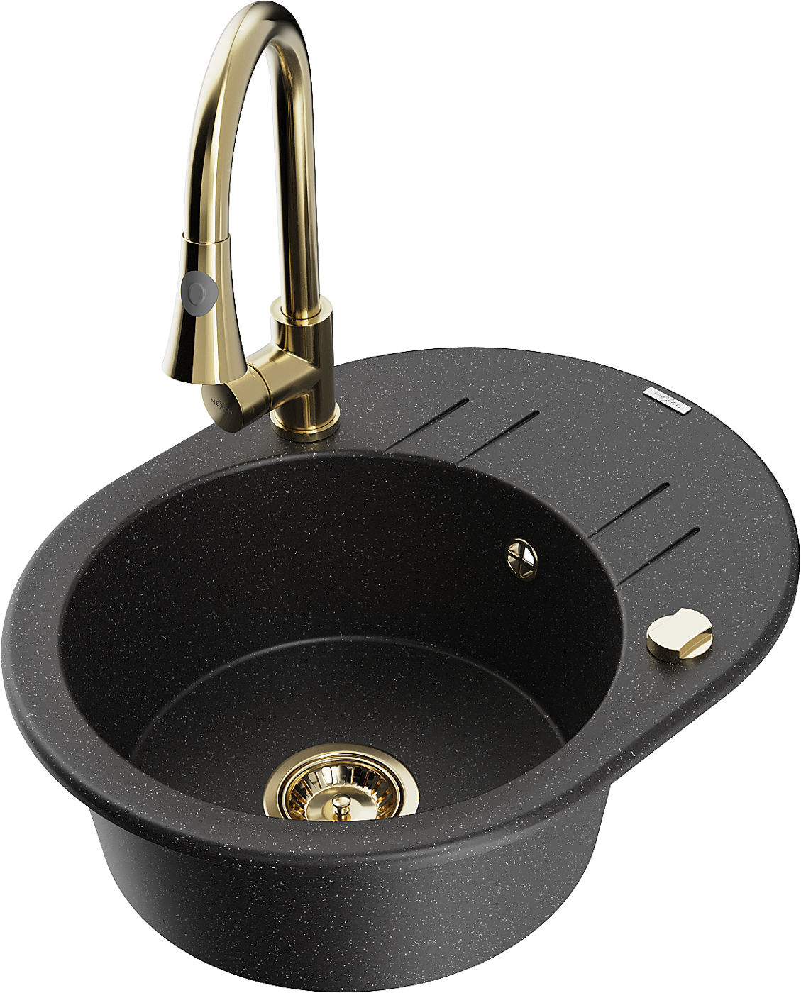 Mexen Kevin zlewozmywak granitowy 1-komorowy z ociekaczem i baterią kuchenną Elia, czarny/srebrny metalik - 6517-73-670101-50