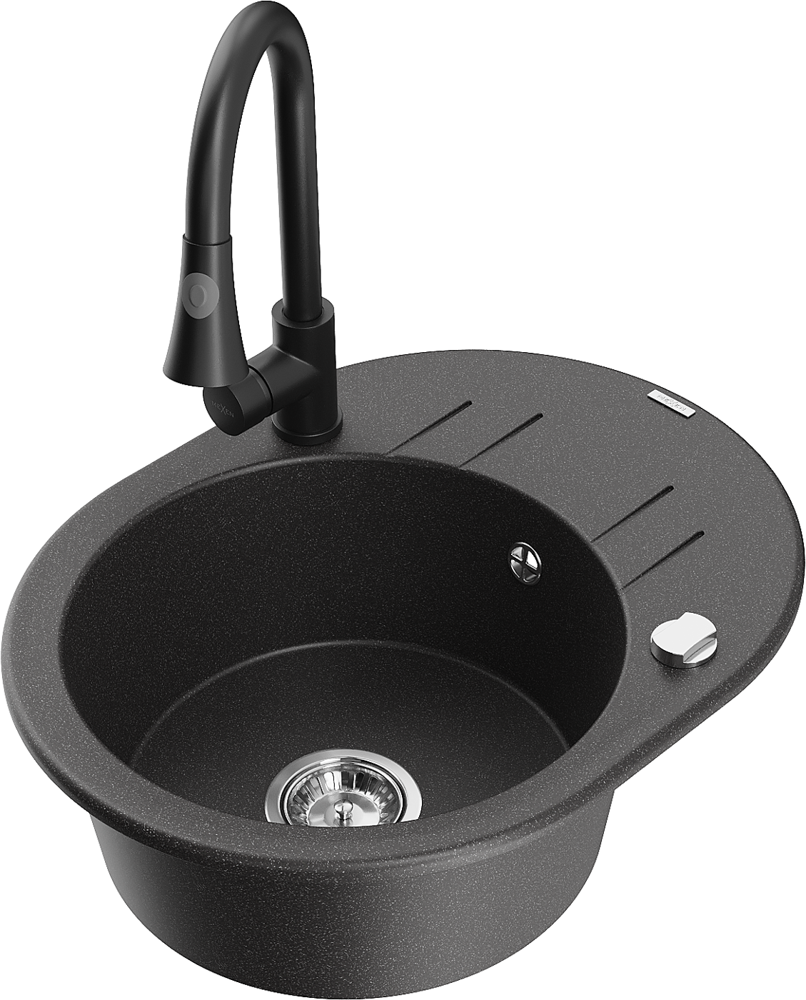 Mexen Kevin zlewozmywak granitowy 1-komorowy z ociekaczem i baterią kuchenną Elia, czarny nakrapiany - 6517-76-670101-70