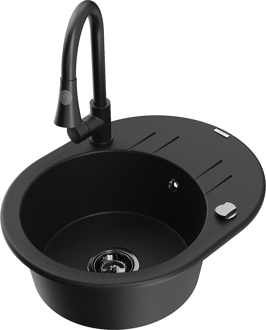 Mexen Kevin zlewozmywak granitowy 1-komorowy z ociekaczem i baterią kuchenną Elia, czarny - 6517-77-670101-70-B