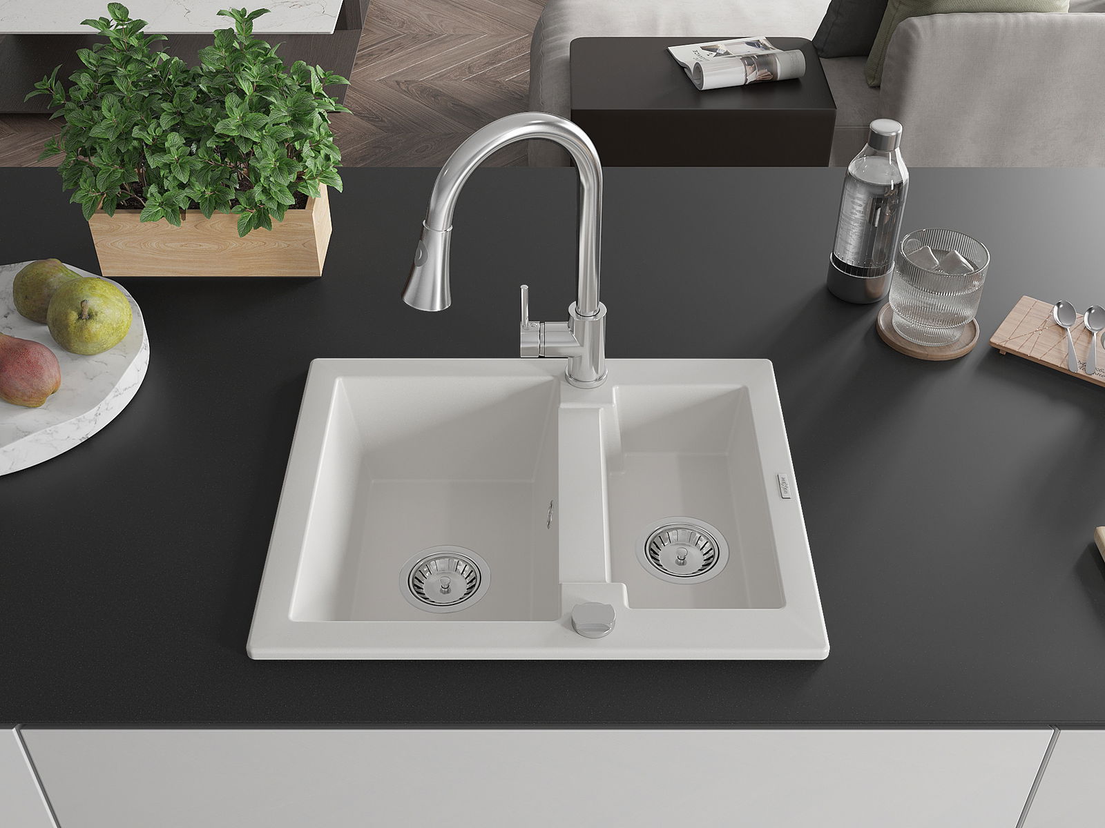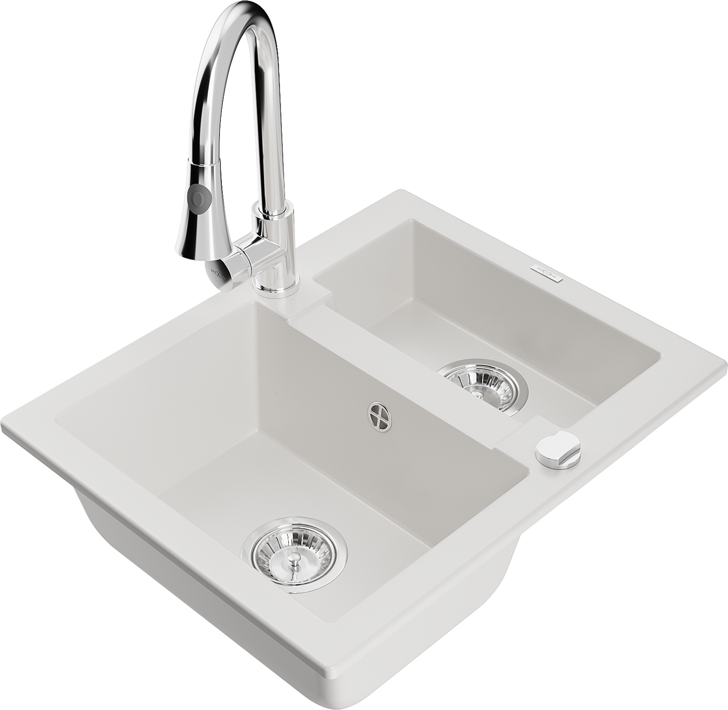 Mexen Carlos zlewozmywak granitowy 1,5-komorowy z baterią kuchenną Elia, biały - 6518-20-670101-00
