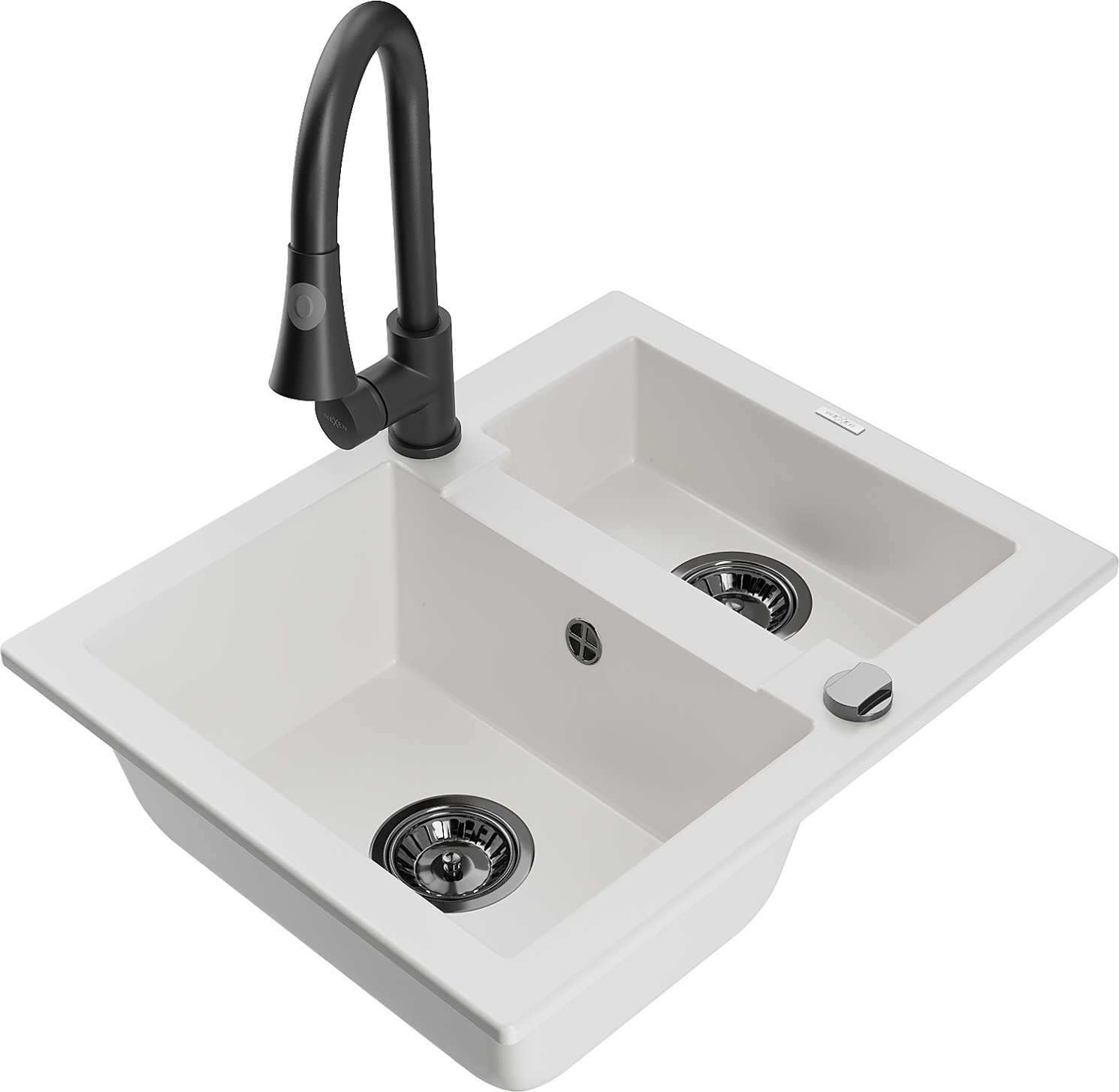 Mexen Carlos zlewozmywak granitowy 1,5-komorowy z baterią kuchenną Elia, biały - 6518-20-670101-70