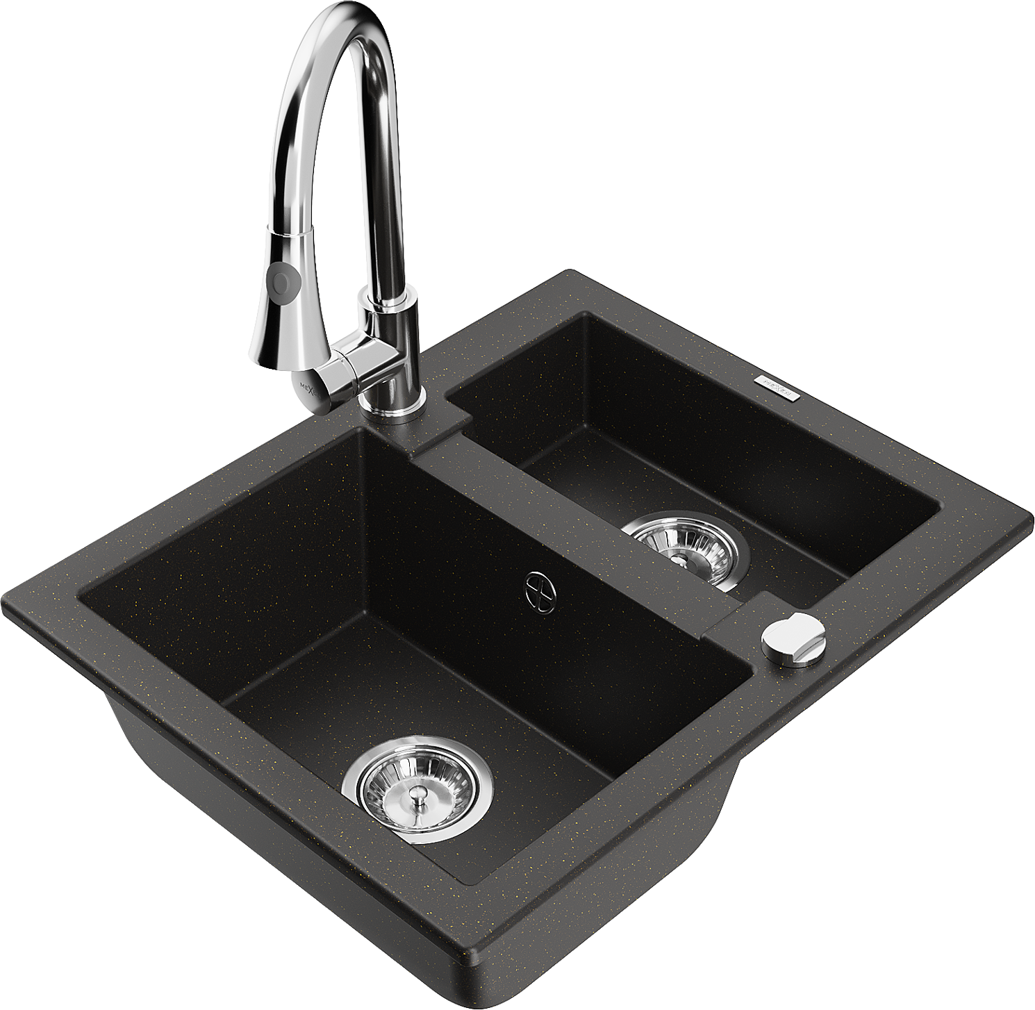Mexen Carlos zlewozmywak granitowy 1,5-komorowy z baterią kuchenną Elia, czarny/złoty metalik - 6518-75-670101-00