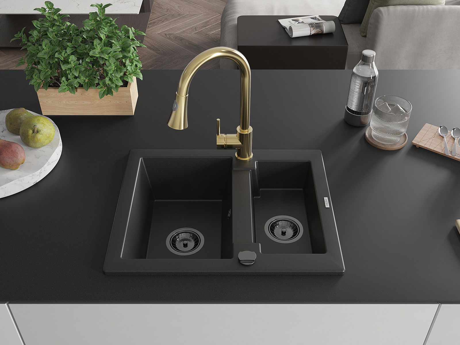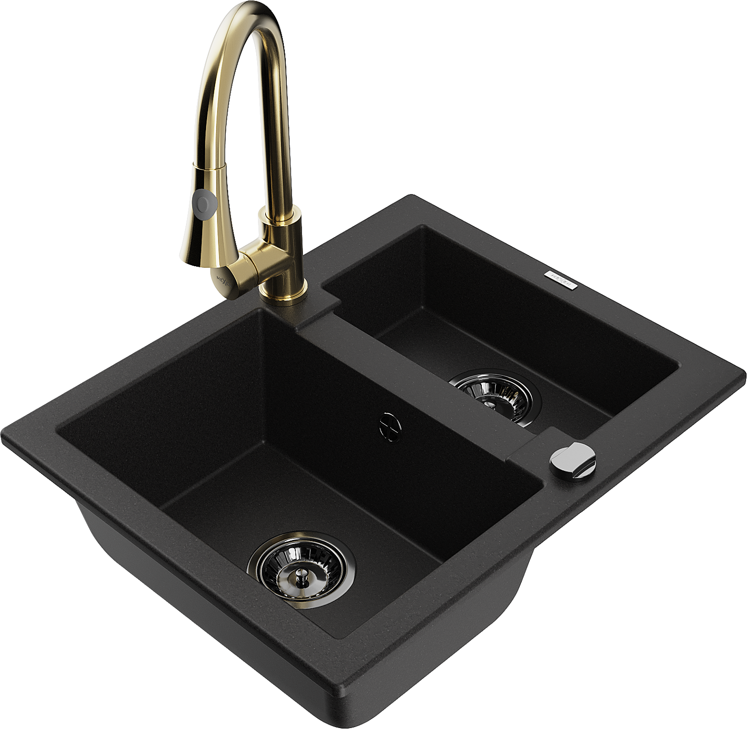 Mexen Carlos zlewozmywak granitowy 1,5-komorowy z baterią kuchenną Elia, czarny - 6518-77-670101-50-B