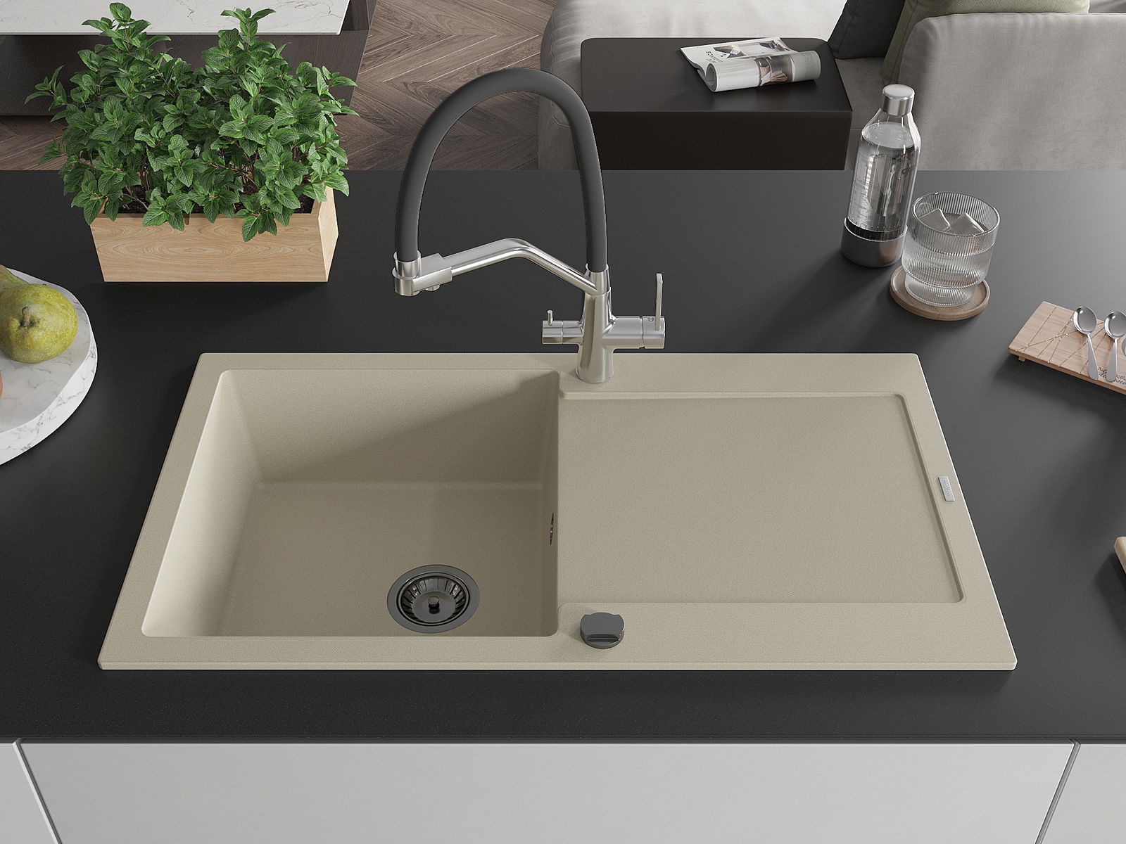 Zlewozmywak został wykonany z wysokiej jakości granitu. Stanowi eleganckie, a przede wszystkim praktyczne uzupełnienie każdej kuchni, niezależnie od jej stylu. Wysoka jakość oraz trwałość granitu zapewniają wieloletnie użytkowanie.