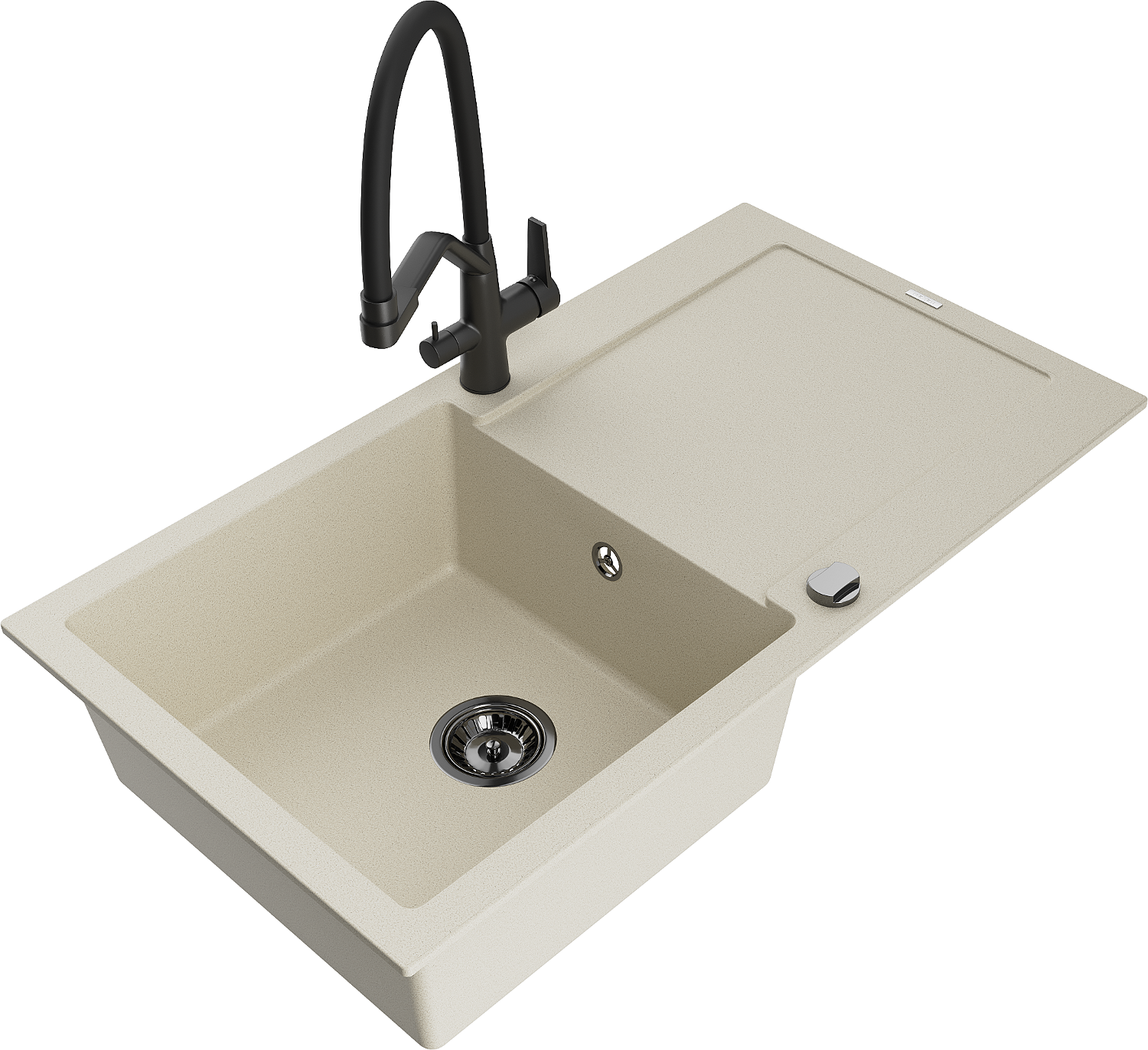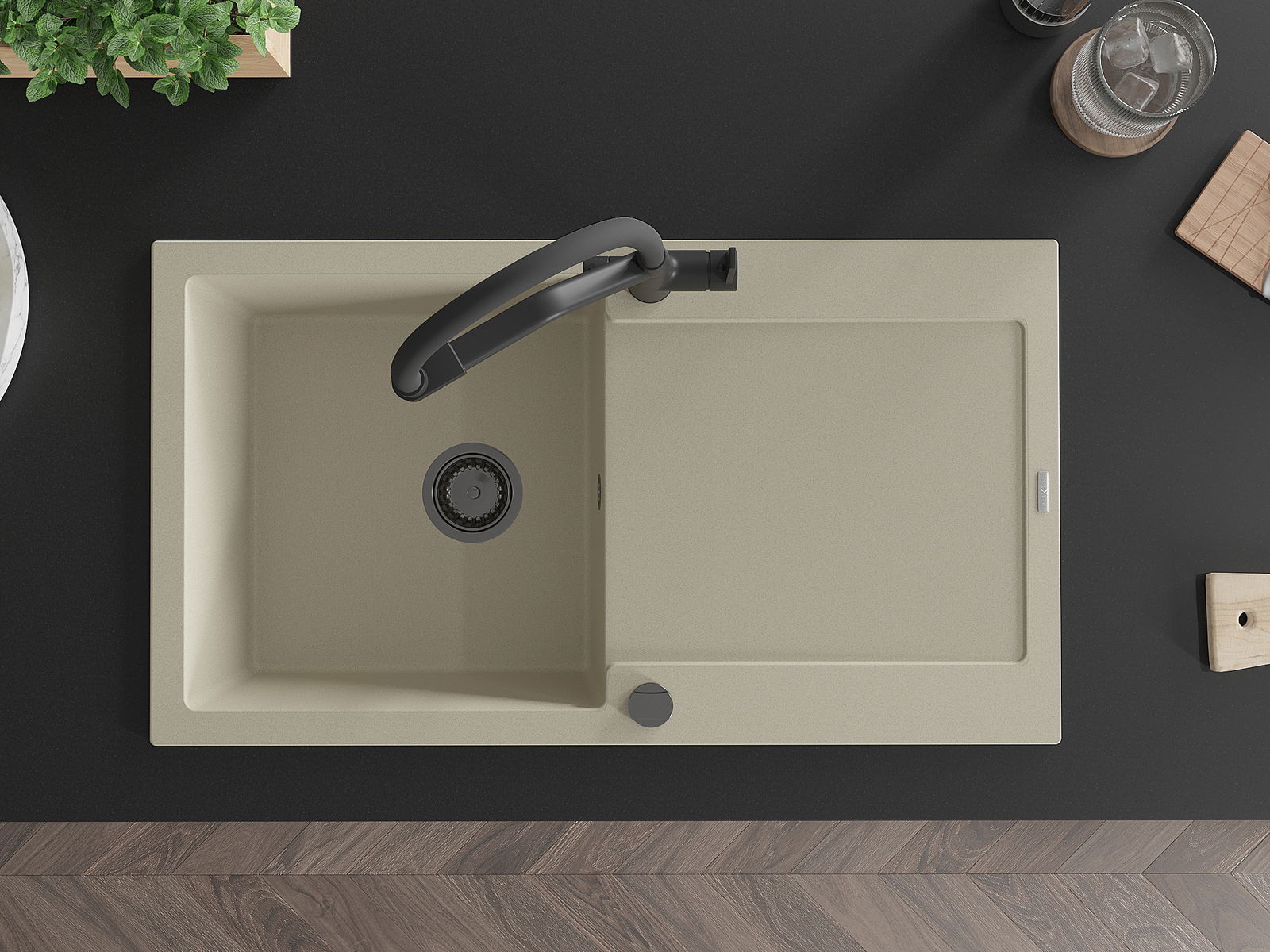 Mexen Leo zlewozmywak granitowy 1-komorowy z ociekaczem i baterią kuchenną Duo, beżowy - 6501-69-671701-70-B