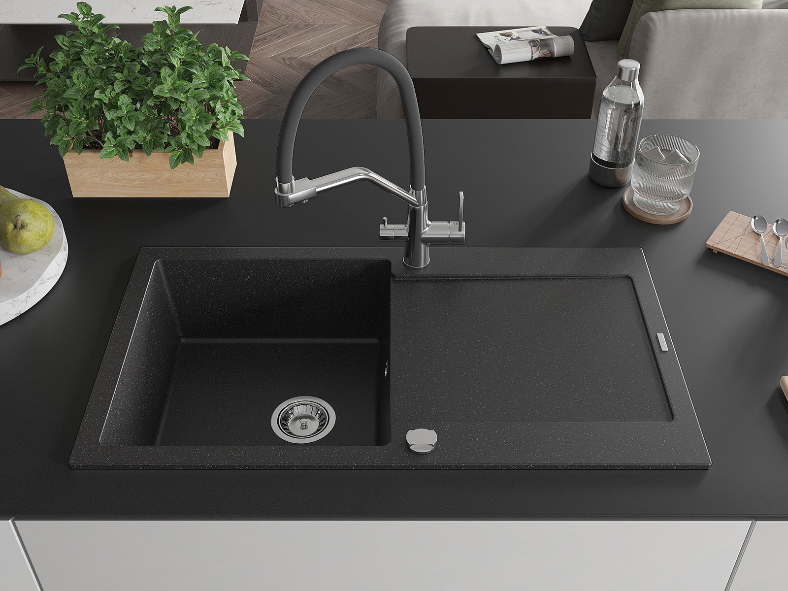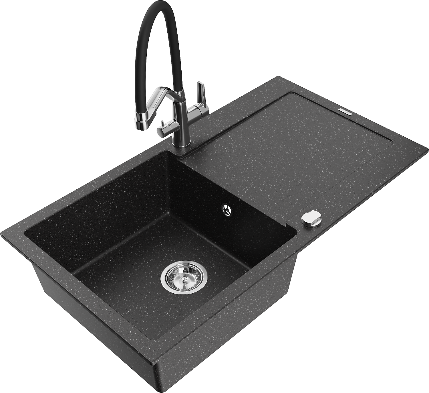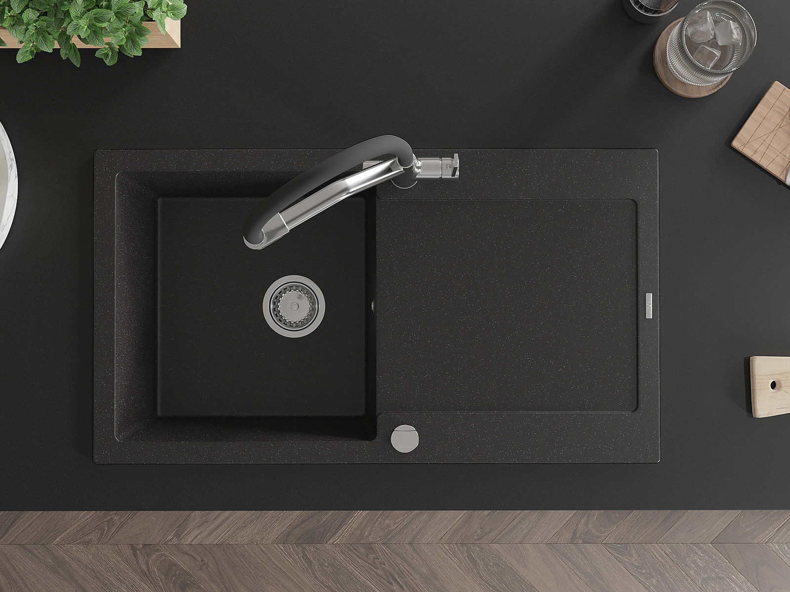 Mexen Leo zlewozmywak granitowy 1-komorowy z ociekaczem i baterią kuchenną Duo, czarny/srebrny metalik - 6501-73-671701-07