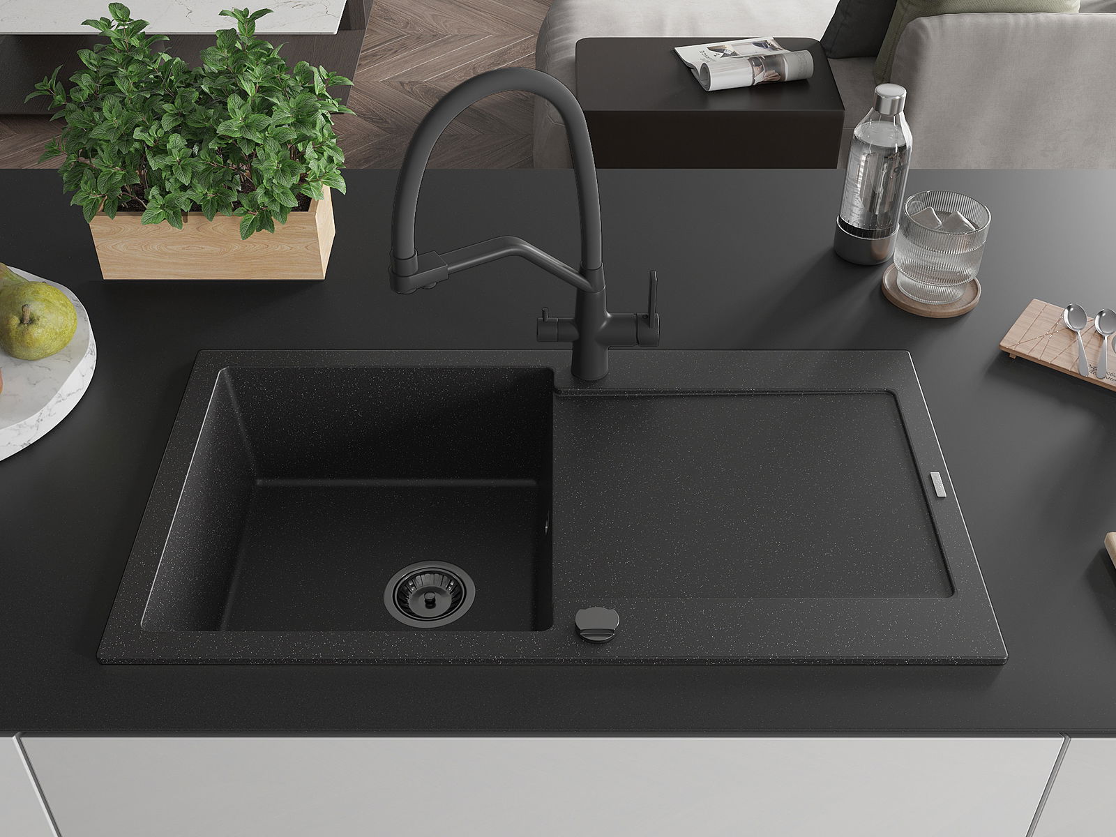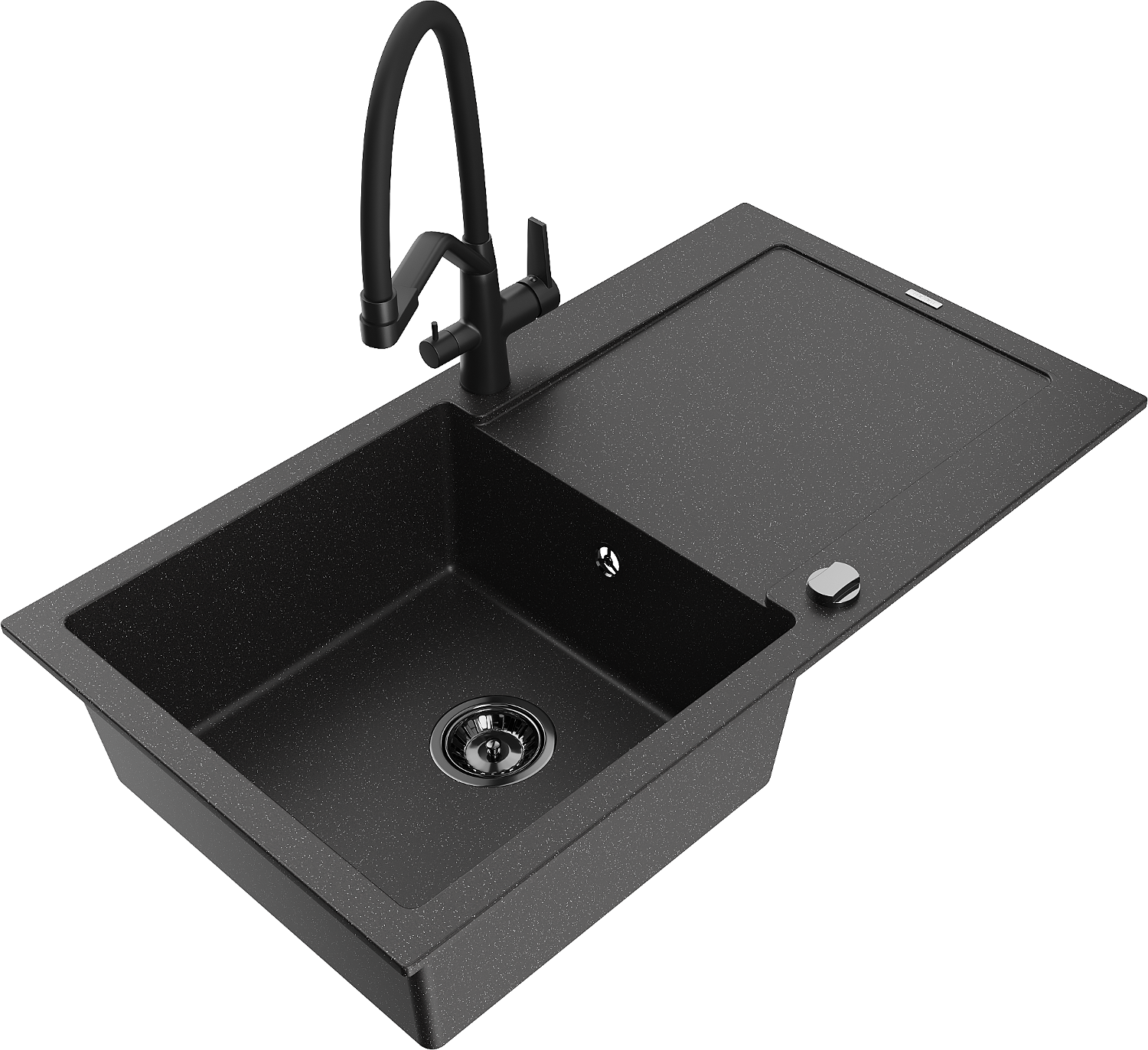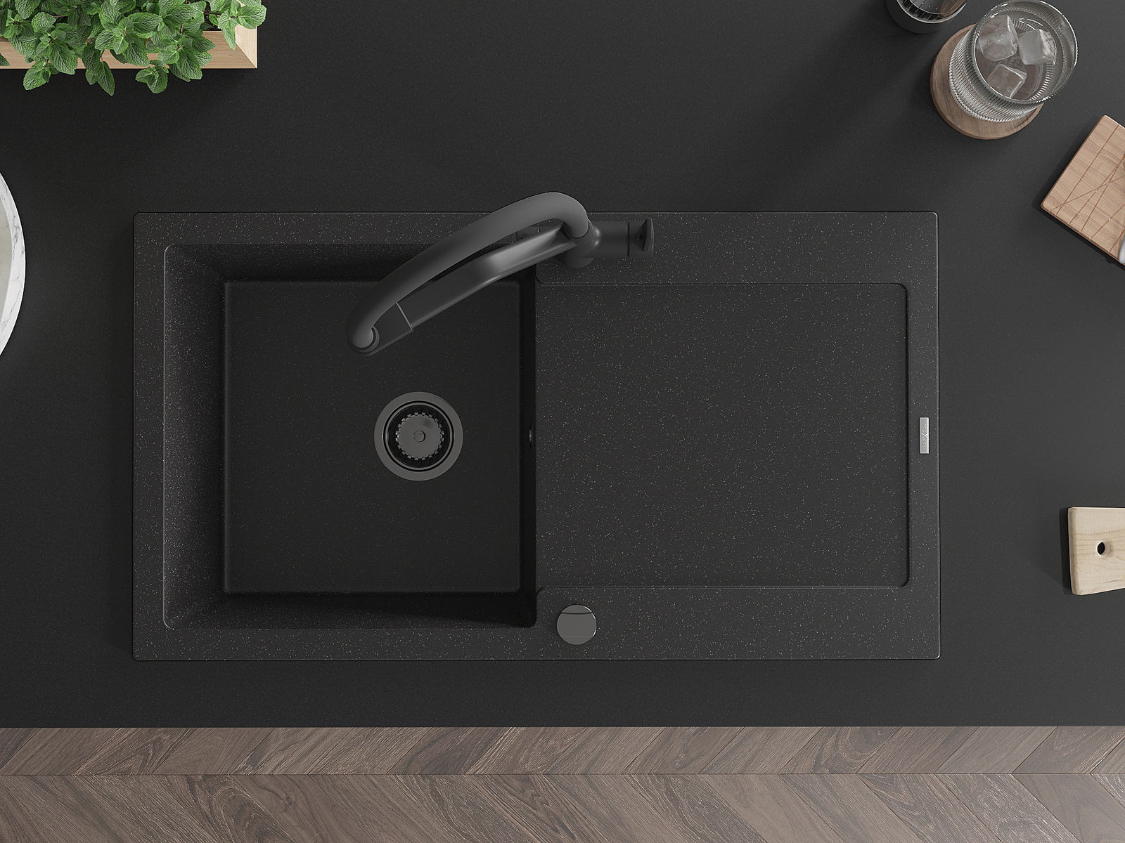 Mexen Leo zlewozmywak granitowy 1-komorowy z ociekaczem i baterią kuchenną Duo, czarny/srebrny metalik - 6501-73-671701-70-B