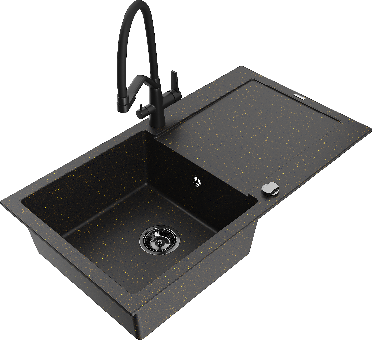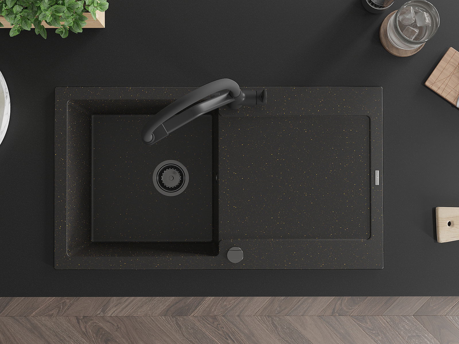 Mexen Leo zlewozmywak granitowy 1-komorowy z ociekaczem i baterią kuchenną Duo, czarny/złoty metalik - 6501-75-671701-70-B