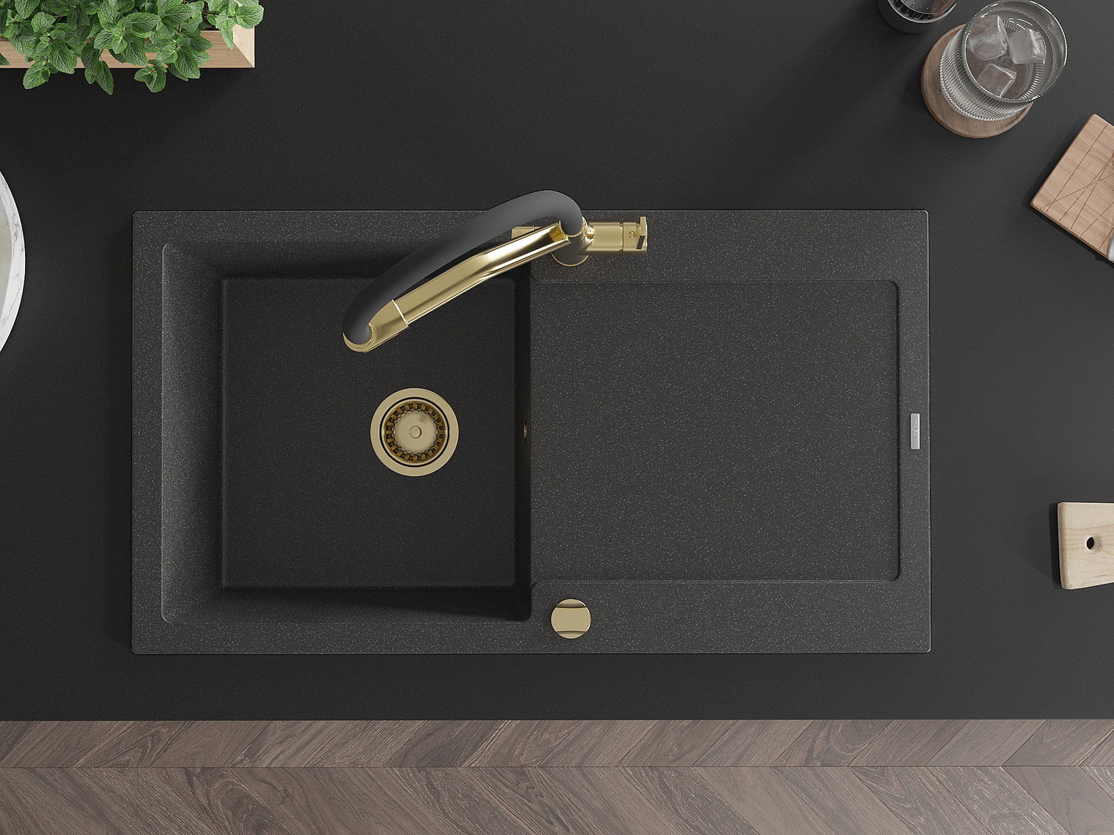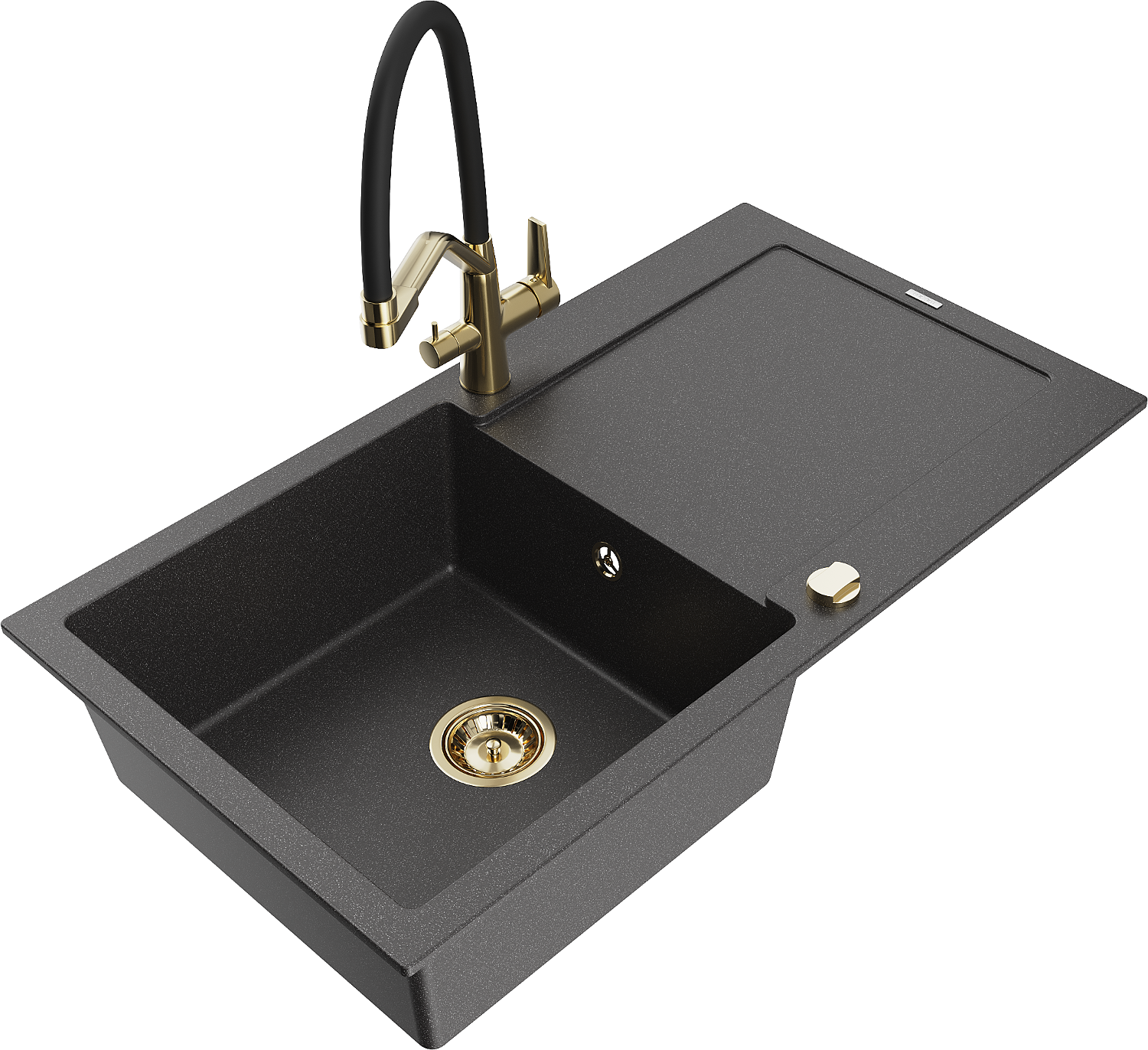 Mexen Leo zlewozmywak granitowy 1-komorowy z ociekaczem i baterią kuchenną Duo, czarny nakrapiany - 6501-76-671701-57-G