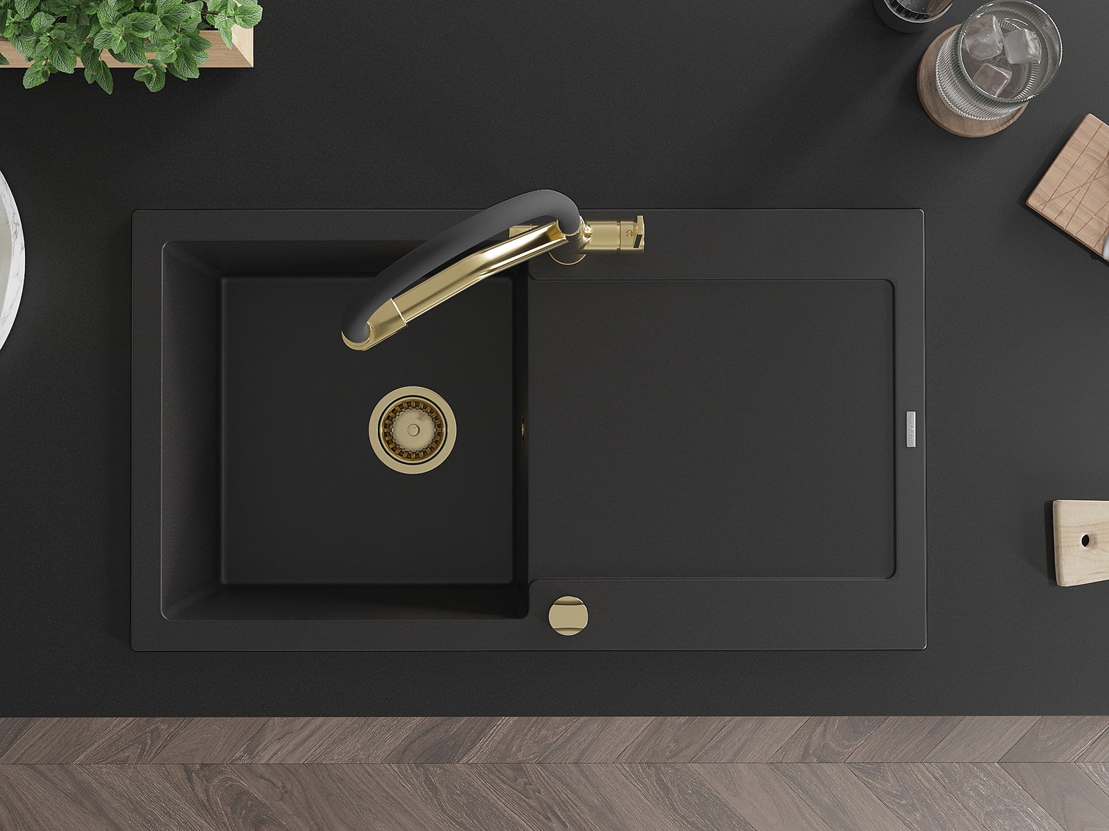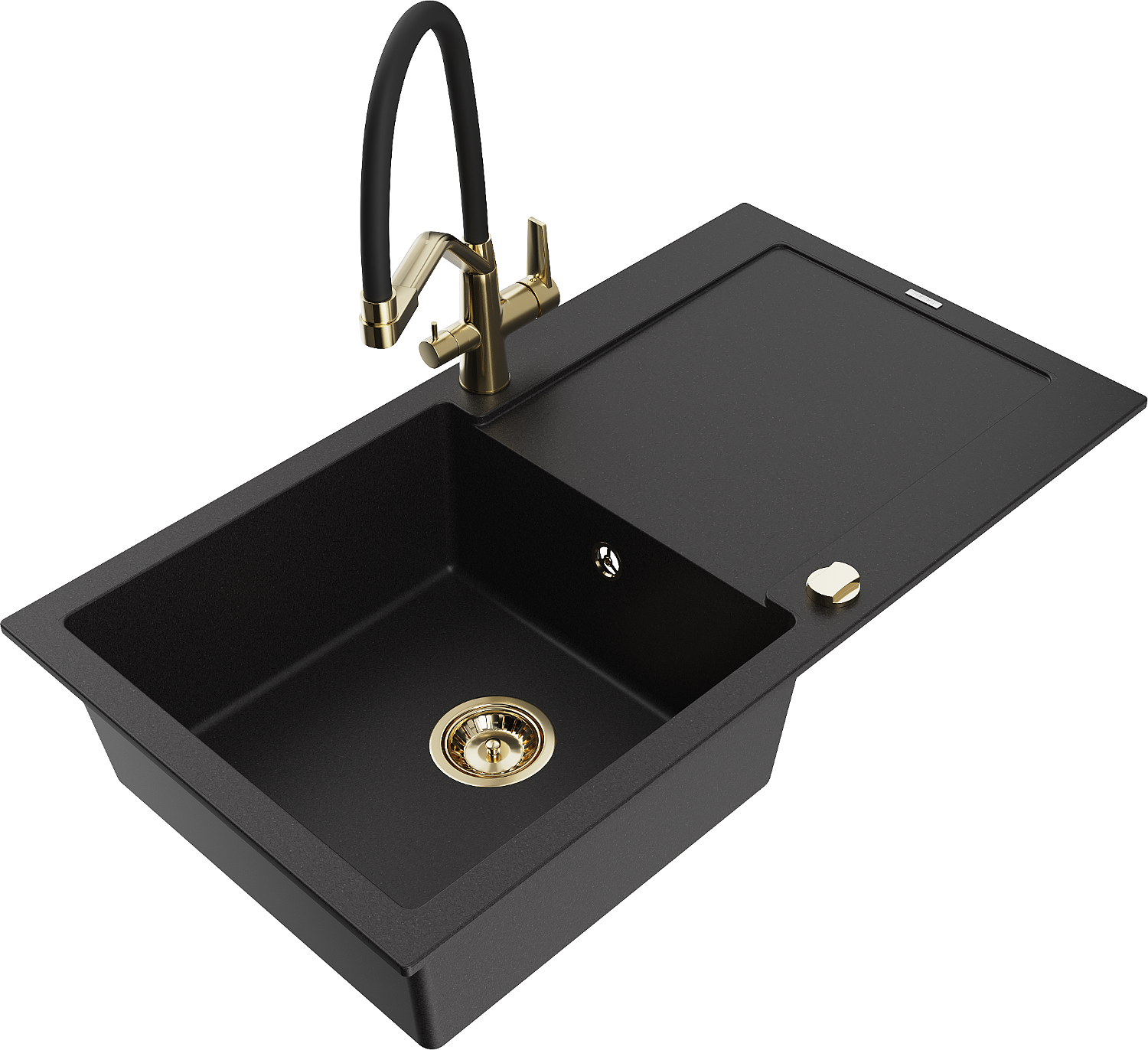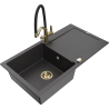 Mexen Leo zlewozmywak granitowy 1-komorowy z ociekaczem i baterią kuchenną Duo, czarny - 6501-77-671701-57-G